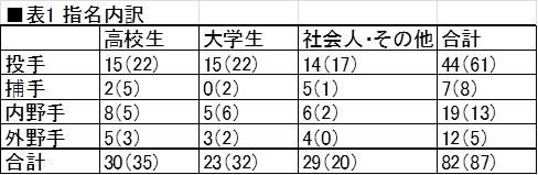 表1に「最終経歴別内訳」をまとめた。前年と比べると社会人選手(独立リーグ含む)の指名数が増えた一方で、高校生、大学生が大きく指名を減らした。社会人の29選手中、大学を経ているのは19人(中退含む)で、25歳でのプロ入りが3人いる。ポジション別では投手が44人で全体の約53.7㌫。16年は投手の指名が70㌫を超えていたが、15年は57.5㌫だったため、以前の水準に近づいた。16年は高評価を受ける投手が多く、12球団のドラフト1、2位の24選手中20人が投手と偏重傾向にあった。昨年は高校生野手4人がドラフト1位に顔を並べているのが特徴的だ。全体的に野手の指名数が伸びる中では大学生捕手に指名がなかった。