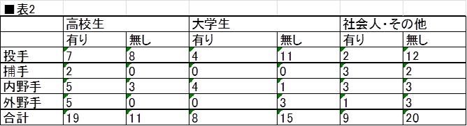 表2は「甲子園出場歴別内訳」。最終経歴別に甲子園出場の有無の人数を調べた。高校生30人中、甲子園出場歴があるのは19人で63㌫。これが大学生では23人中8人(34.8㌫)、社会人・その他では29人中9人(31.0㌫)となる。特に評価が難しい野手は、甲子園出場でのアピールが高校からドラフト指名されるための近道になっているように見える。逆に投手は甲子園出場歴がなくとも、大学、社会人と実戦でのアピール機会の場を得ることがプロへの道につながっていく。