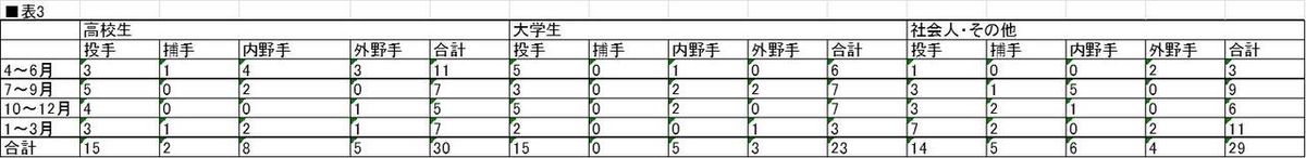 表3は「誕生月別内訳」。4~9月までの前期、10~3月までの後期で生まれ月を見ていくと、高校生年代では前期18、後期12と前期が上回るが、大学生年代では前期13、後期10まで差が縮まり、社会人・その他では前期12、後期17と逆転する。暦年齢による身体の大きさや運動能力の差が若年齢でのタレントの発掘に結びついていると考えられる。その考察はベースボール・クリニック誌2016年11月号~17年6月号まで連載した「生まれ月による野球力格差の検証」に詳しい。