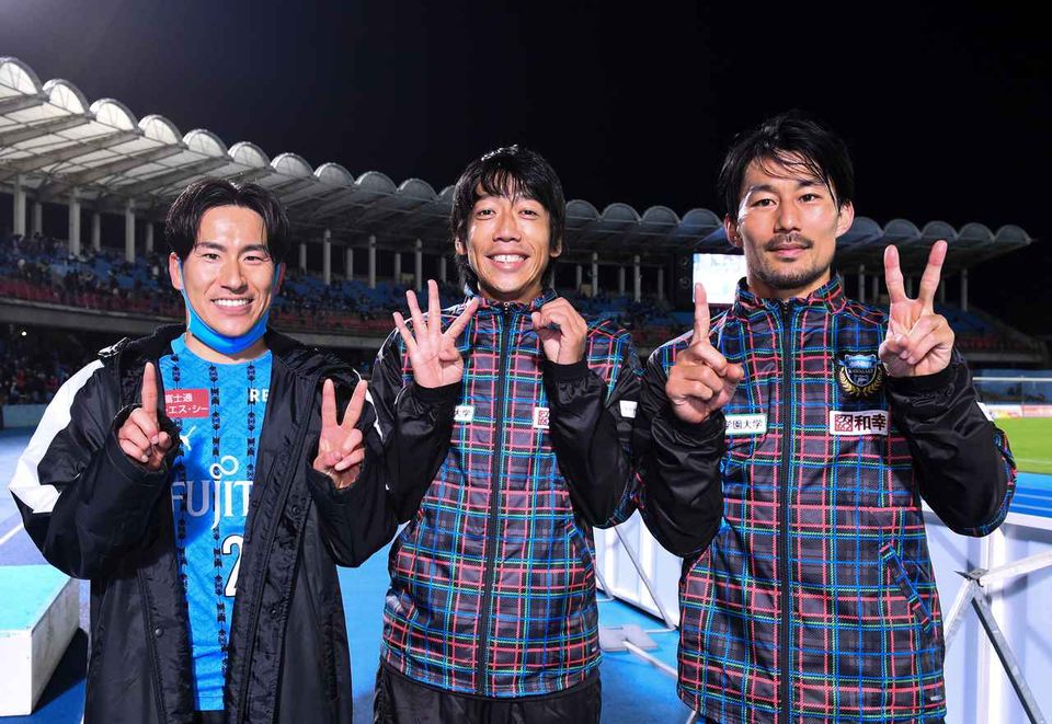 上写真=中村(中央)が年齢の「40」を、登里(左)と家長が連勝記録の「12」を示してお祝い!(写真◎J.LEAGUE)