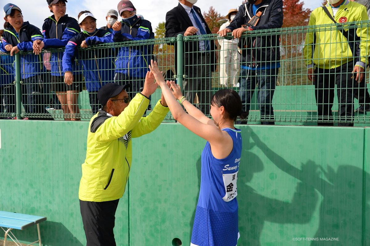 女子のチーム サニーブリーズは、ベストを迎えた決勝戦、松本里紗/上野小町が井腰恵理/中西麻友にG④-1で勝ったあと、シングルスの金城佳奈が鈴木夕海にストレート勝ちし優勝を決めた。金城が応援席に駆け寄ると、メンバーの目からは次々と涙。緊張から解放され喜びを抑えることができなかった。