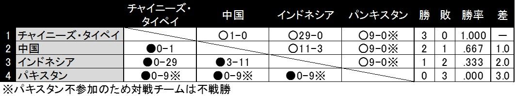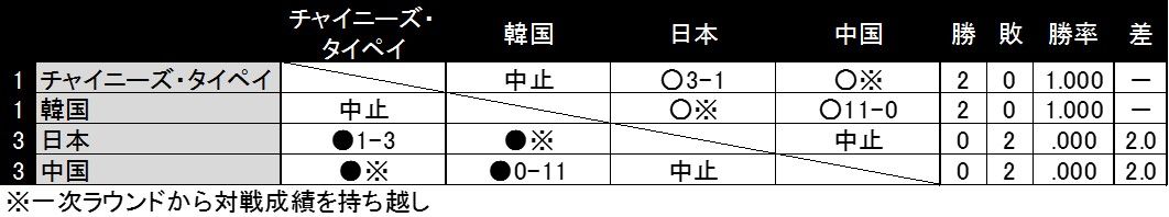 9月8日に予定されていた「チャイニーズ・タイペイ対韓国」、「日本対中国」は雨天のため中止。この時点で同一カードであるチャイニーズ・タイペイ対韓国の決勝戦、日本対中国の3位決定戦が決定していたため、同試合は延期ではなく打ち切りとなった。