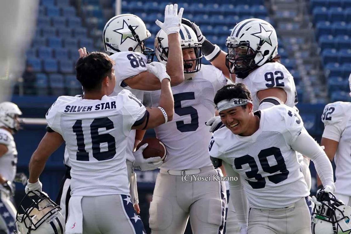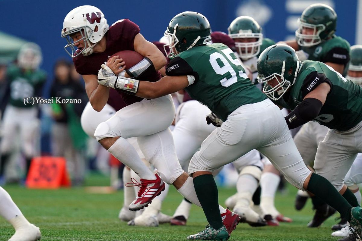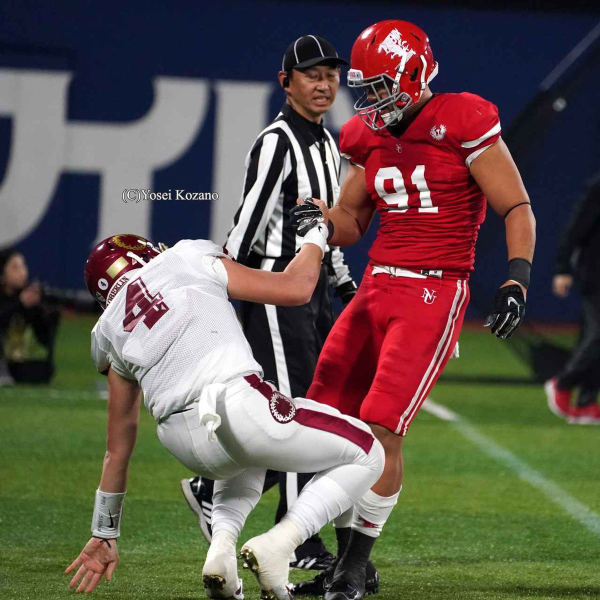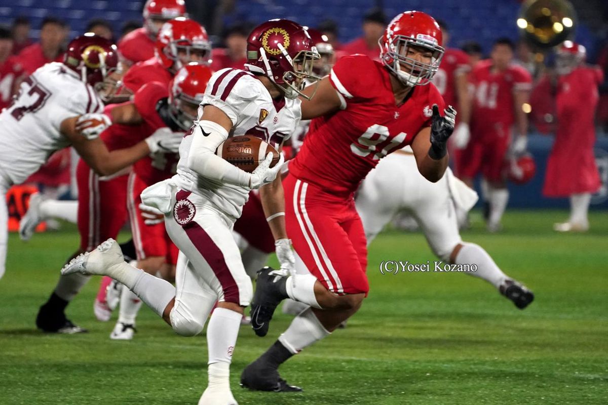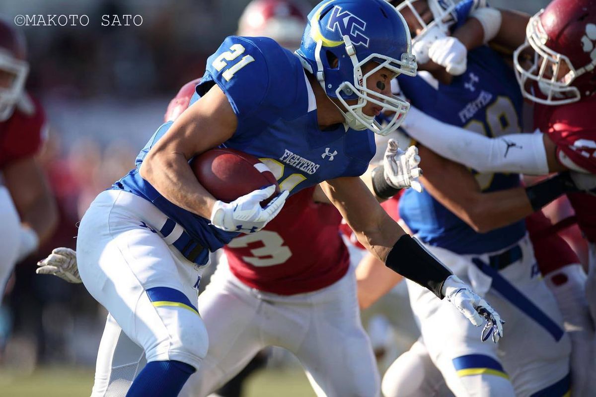 FG1本ずつを加えた第4Q5分、WR林裕嗣が78ヤードのリターンTD。これを皮切りに日大はRB川上理宇の59ヤードランTD、DB岩﨑匠の35ヤードインターセプトリターンTDとビッグプレーを連発、勝負を決めた。