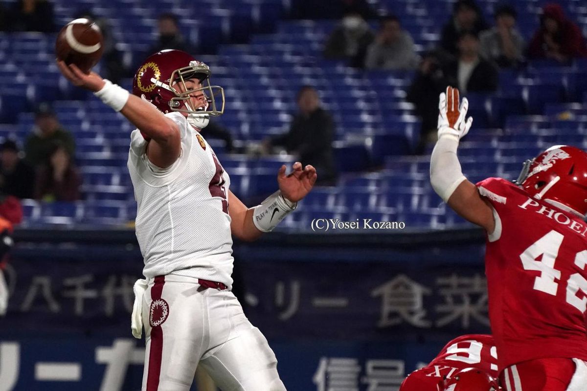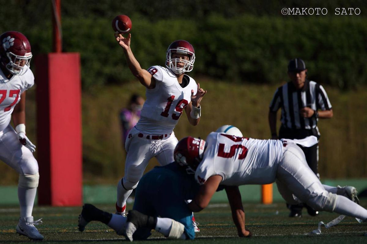 日大QB林は、試合冒頭から9回連続でパスを決めるなど232ヤード3TD、ランでも7回29ヤードと活躍した。桜美林QB亀山はパス310ヤード2TDながら3インターセプト。終始追う展開が続き、キャッチアップオフェンスとなったため、パスを狙われたのが響いた。