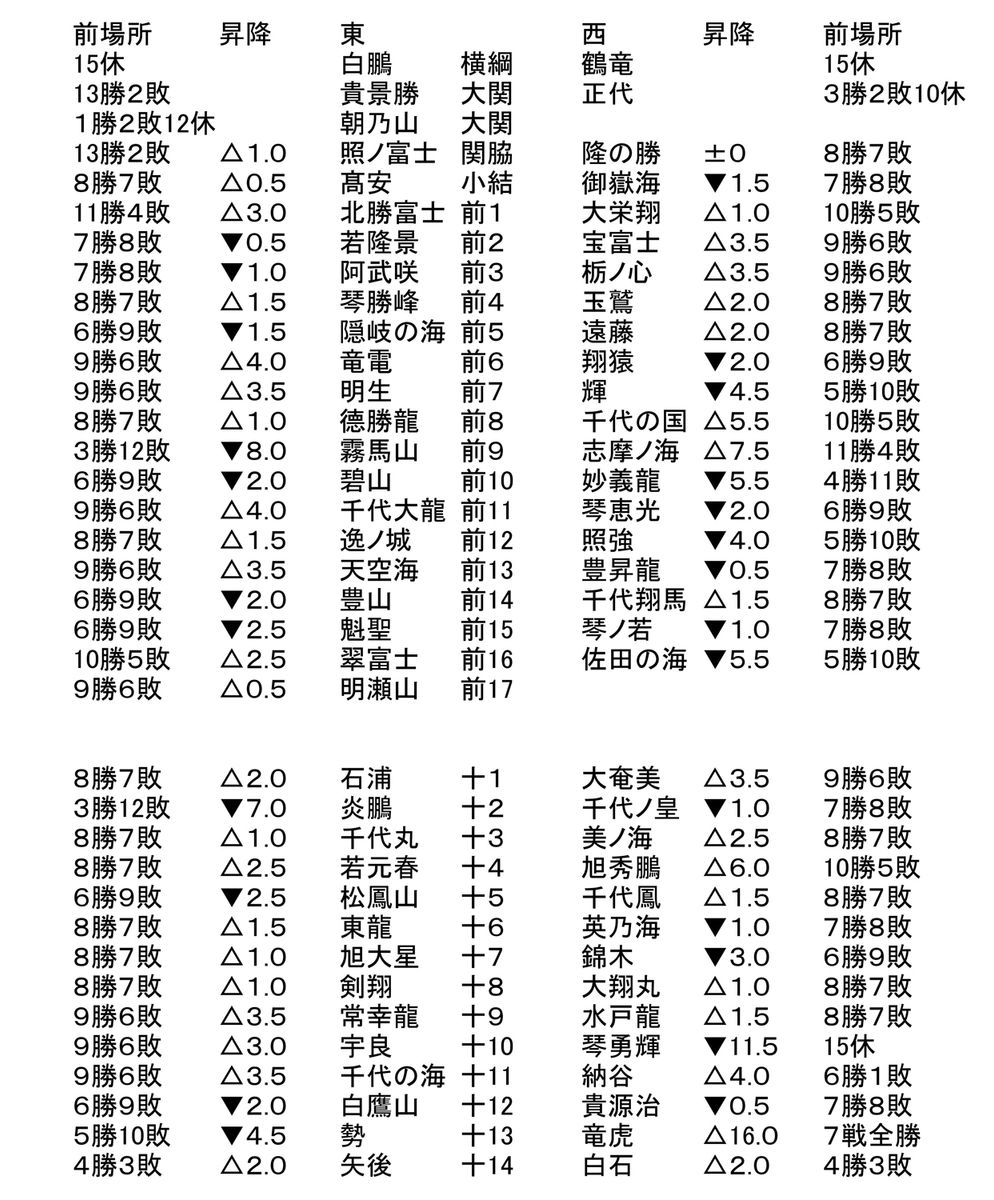 十両と幕下の入れ替えは、十両から落ちる成績の力士が富士東、阿炎、錦富士の3人。千秋楽の相撲で敗れれば幕下陥落だった勢と貴源治が勝って踏みとどまったため、引退した琴奨菊と合わせて4人が幕下から上がれる。