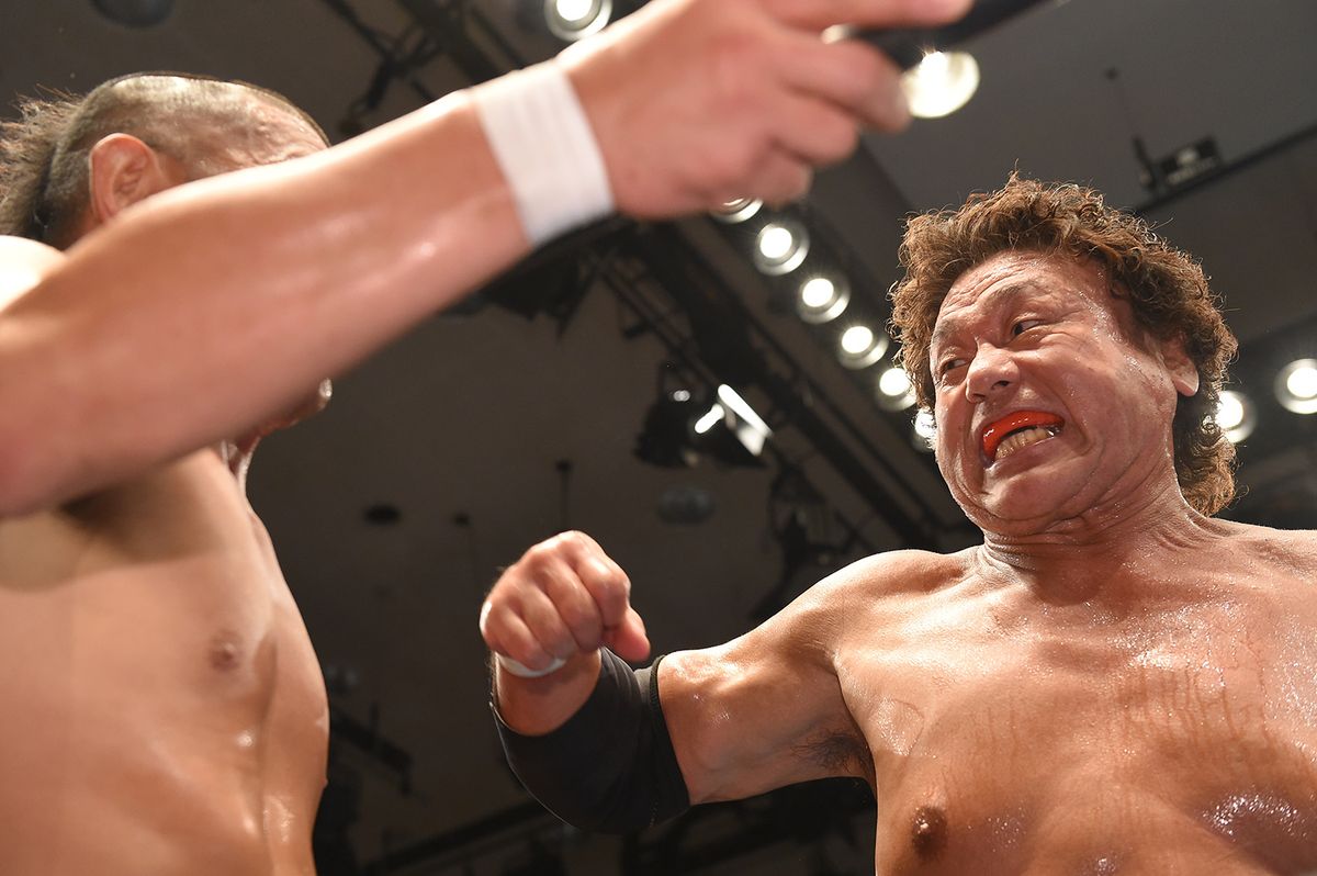 選手名鑑の撮影のためバックステージにいたため、入場前の天龍に遭遇。試合直前のためカメラを向けていいのかグレーゾーンだが一通り撮っちゃったうちの1枚。