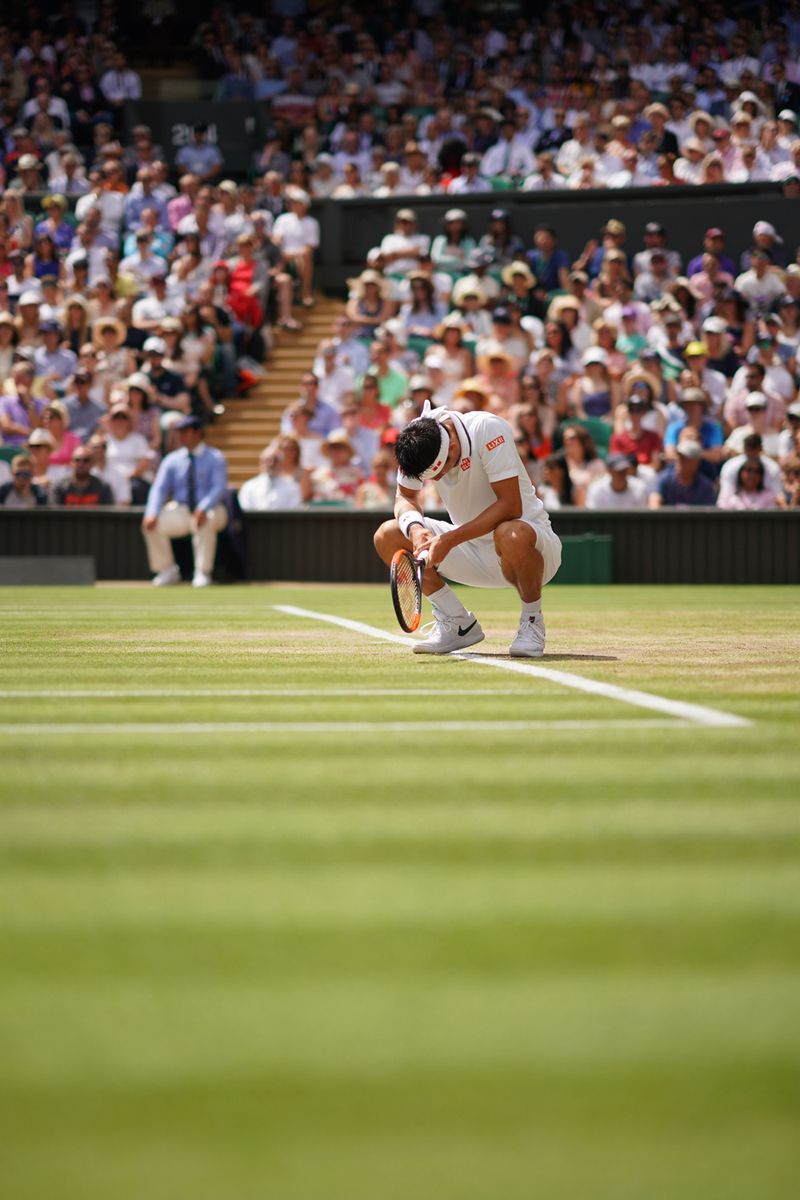 芝のコートで準々決勝まで勝ち上がった今大会、相手はジョコビッチ。‘14全米オープンのように!と期待しながらの撮影でしたが・・・。 打っても打っても返してくるジョコビッチにがっくりの錦織選手。しかし、ここからグランドスラム大会4大会連続ベスト8以上という偉業につながっていきました。