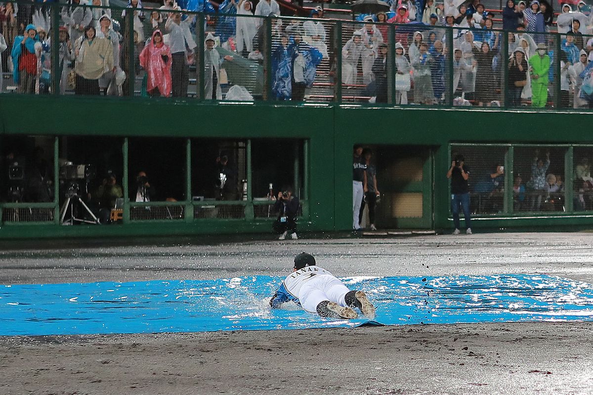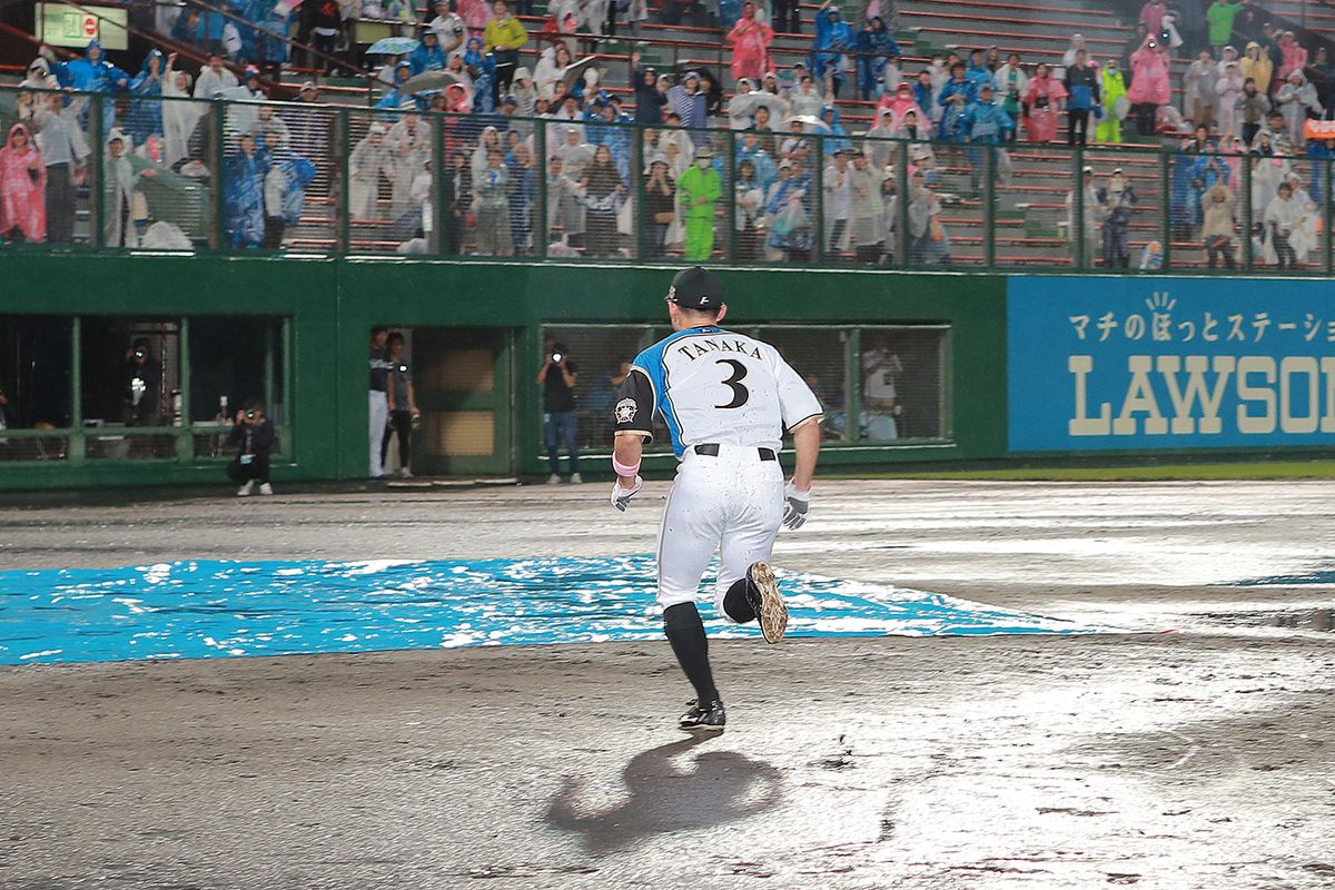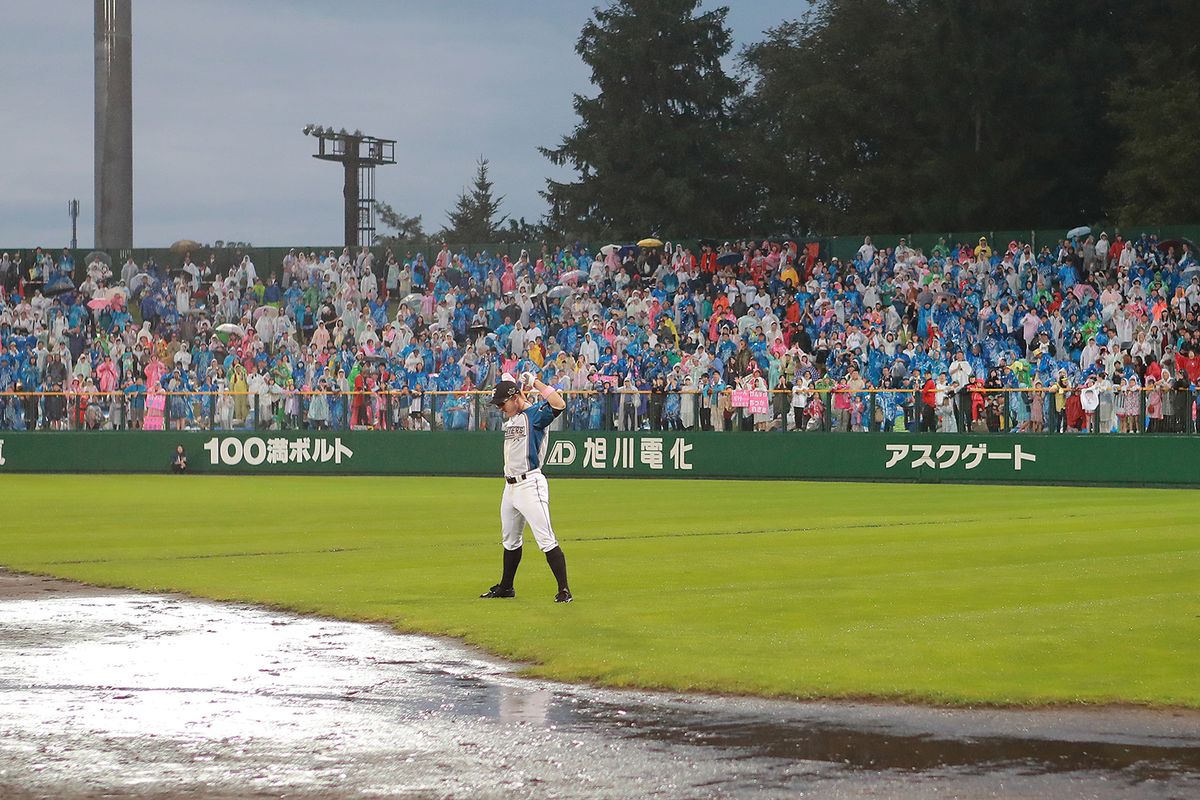 以下の3枚は、2019年9月16日旭川スタルヒン球場。ソフトバンク戦は8回途中降雨コールドに(7対2で日本ハムが勝利)。試合終了後、この年限りでの引退を表明していた田中賢介のユニフォームを着てヘッドスライディングを披露し、ファンを楽しませた。