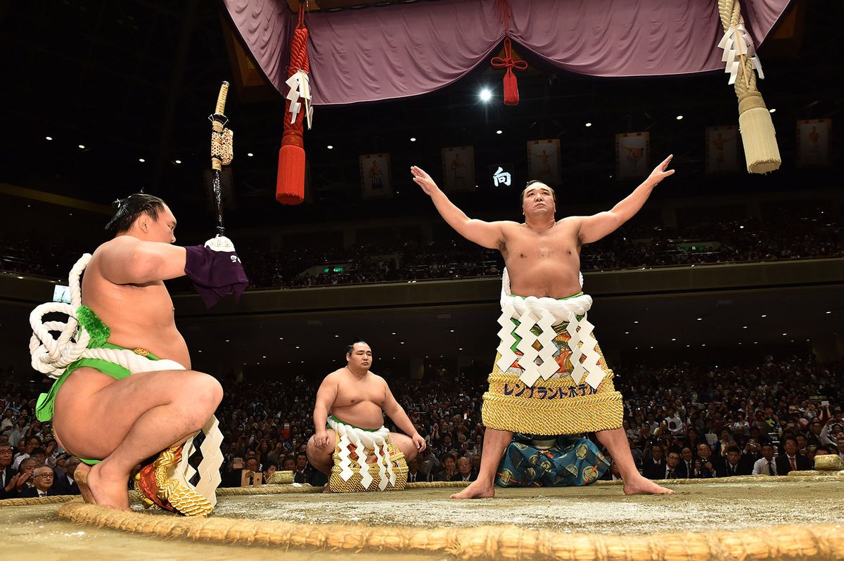 2020年東京五輪・パラリンピックを見据える国際交流イベント「大相撲beyond2020場所」。土俵上で21年ぶりに行われた「三段構え」上段構えを鶴竜(右)と共に披露する。