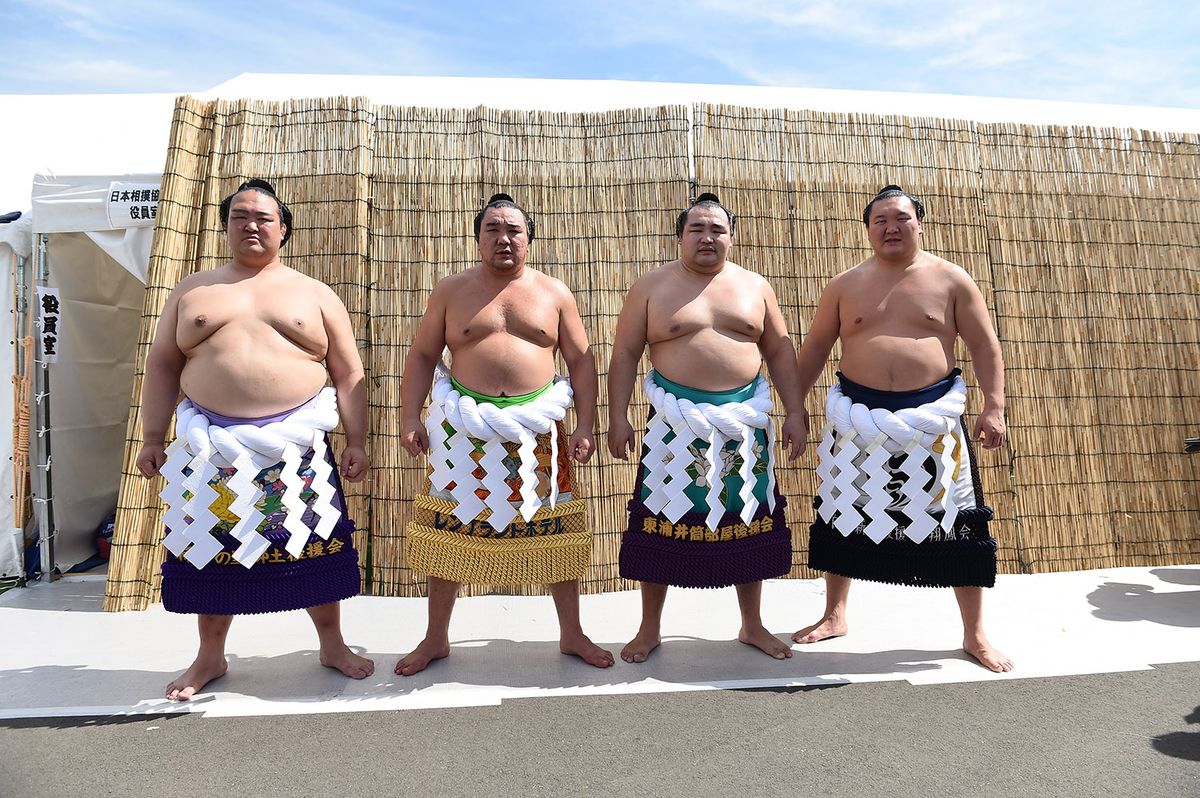 2017年1月場所での稀勢の里昇進により、17年ぶりとなった4横綱。大相撲夏巡業で土俵入り前の記念写真。