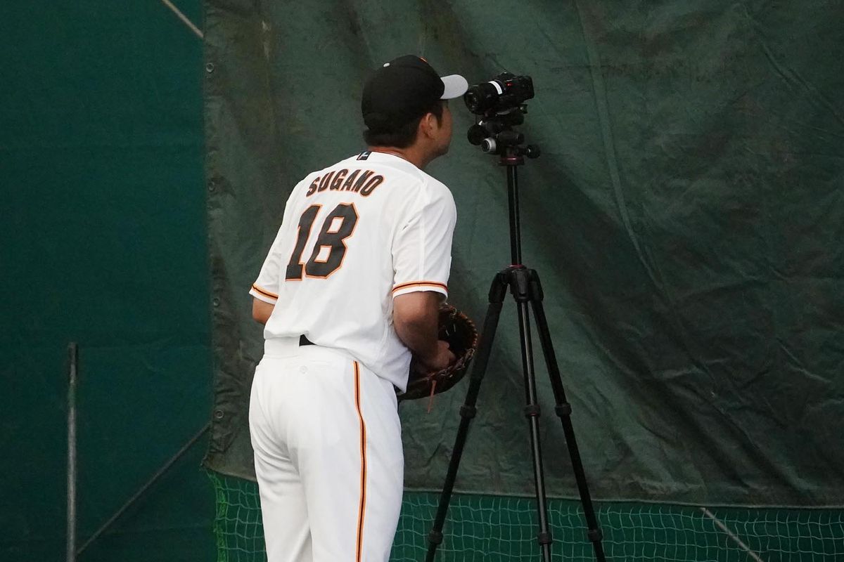 ブルペンでの菅野智之。フォームをチェックするカメラや測定器でボールの起動などをチェックしながら投げ込みを行っています。突然、後ろのカメラをのぞき込んでいました。どうしたんでしょう?自分の感覚と映像とズレがあるのでしょうか?