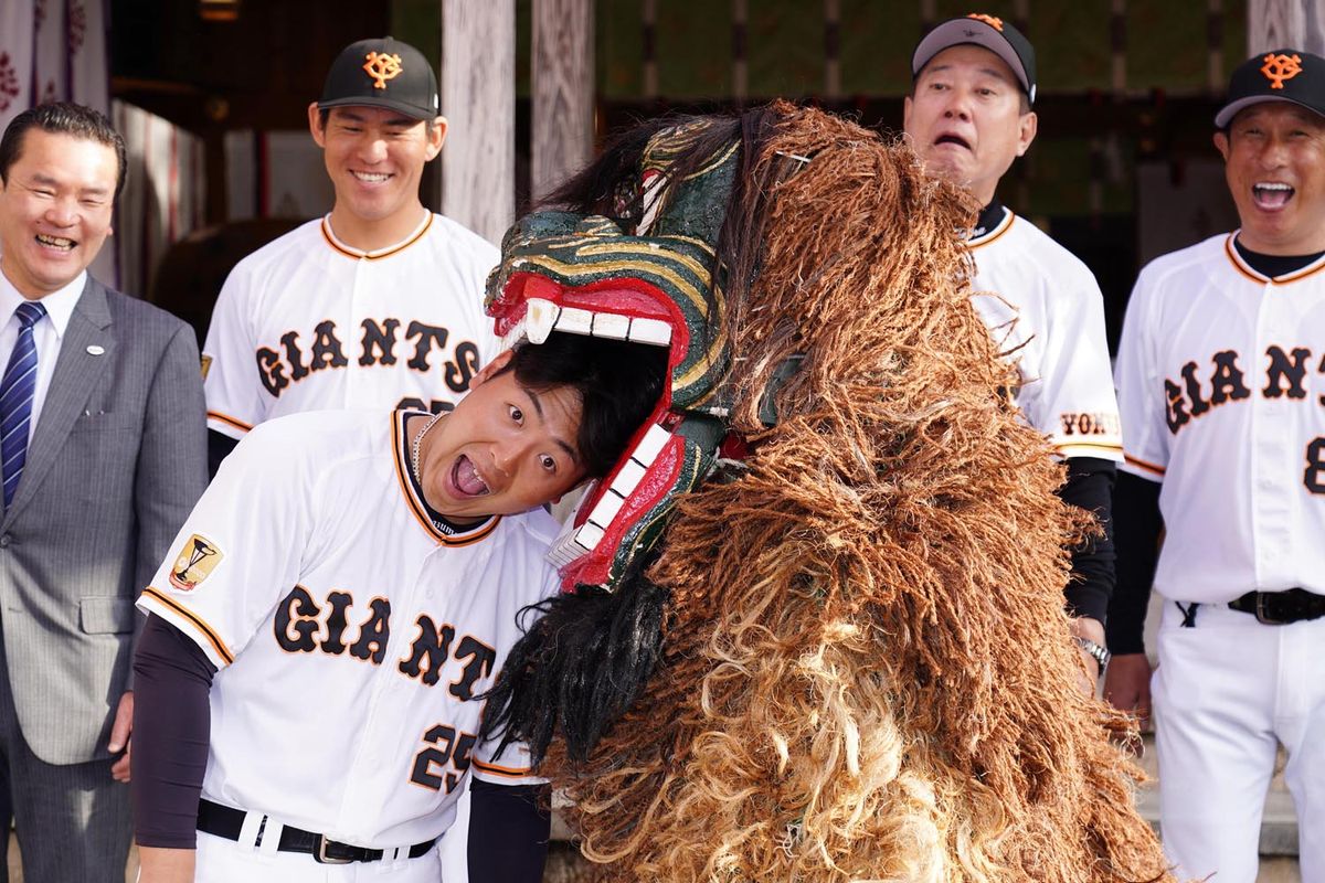 今日から宮崎組がS班に合流し、那覇キャンプが本格的に始まります。練習前は恒例の沖宮参拝。参拝後には原監督が我々メディアにサービスもかねて獅子舞に頭をかまれていました。ところが監督が突然「今年からバトンタッチだ!」と岡本和真にその役を継承することになりました。岡本和真はしっかりとその「顔芸」も継承。良い顔しています!!