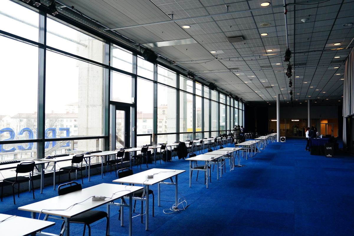 晴れて会場のエリクソン・グローブ内へ。赤い客席が映えます。無観客なのが勿体無い、大きくカッコいい会場でした。静寂のなかで選手が練習をしています。やっとここまで来たかという感動の瞬間でした