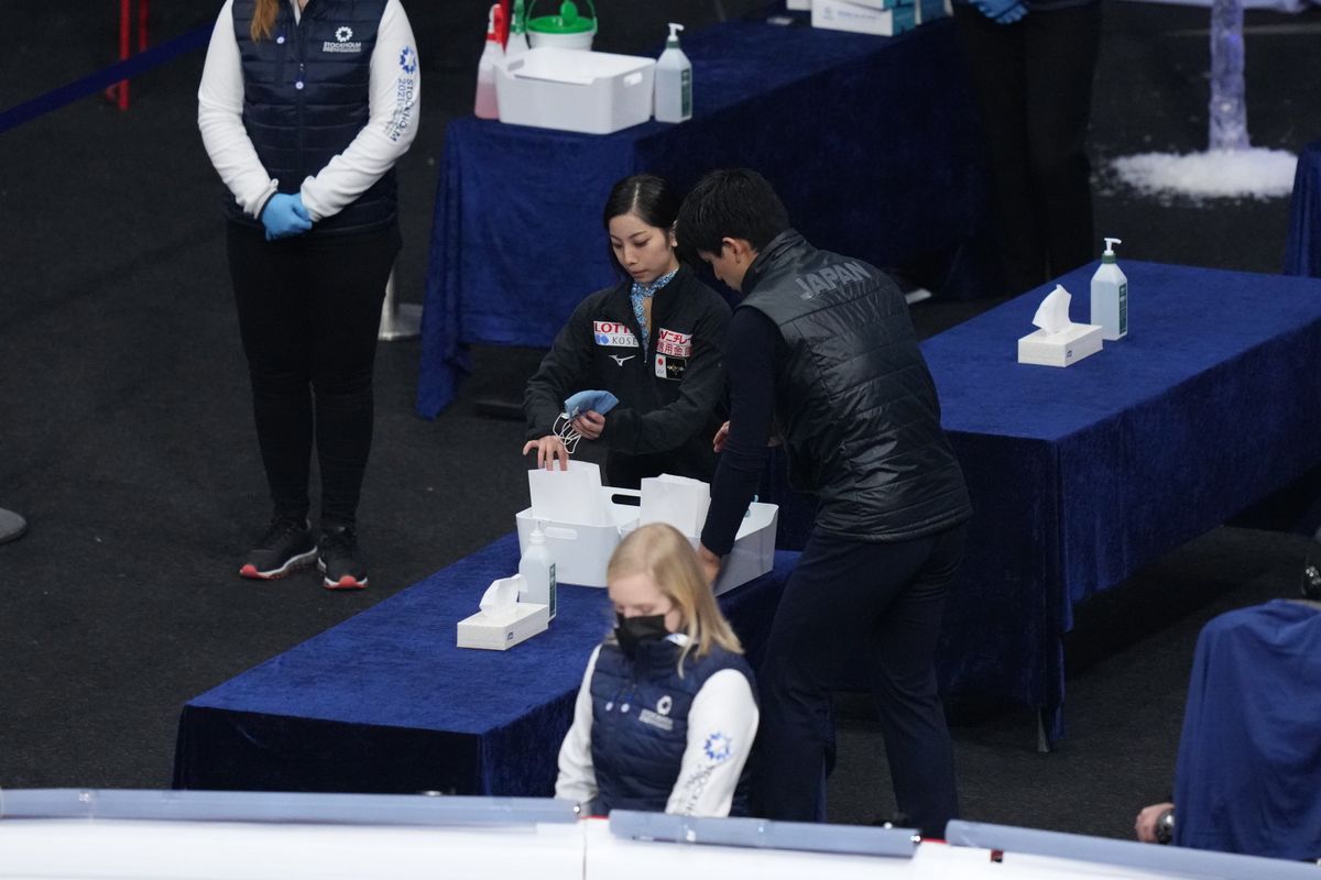 競技前の三浦璃来・木原龍一ペア。感染対策で、選手は個別に与えられたボックスに、マスクやエッジカバーを入れていました。フェンスやキス&クライの消毒も頻繁に行われていました。