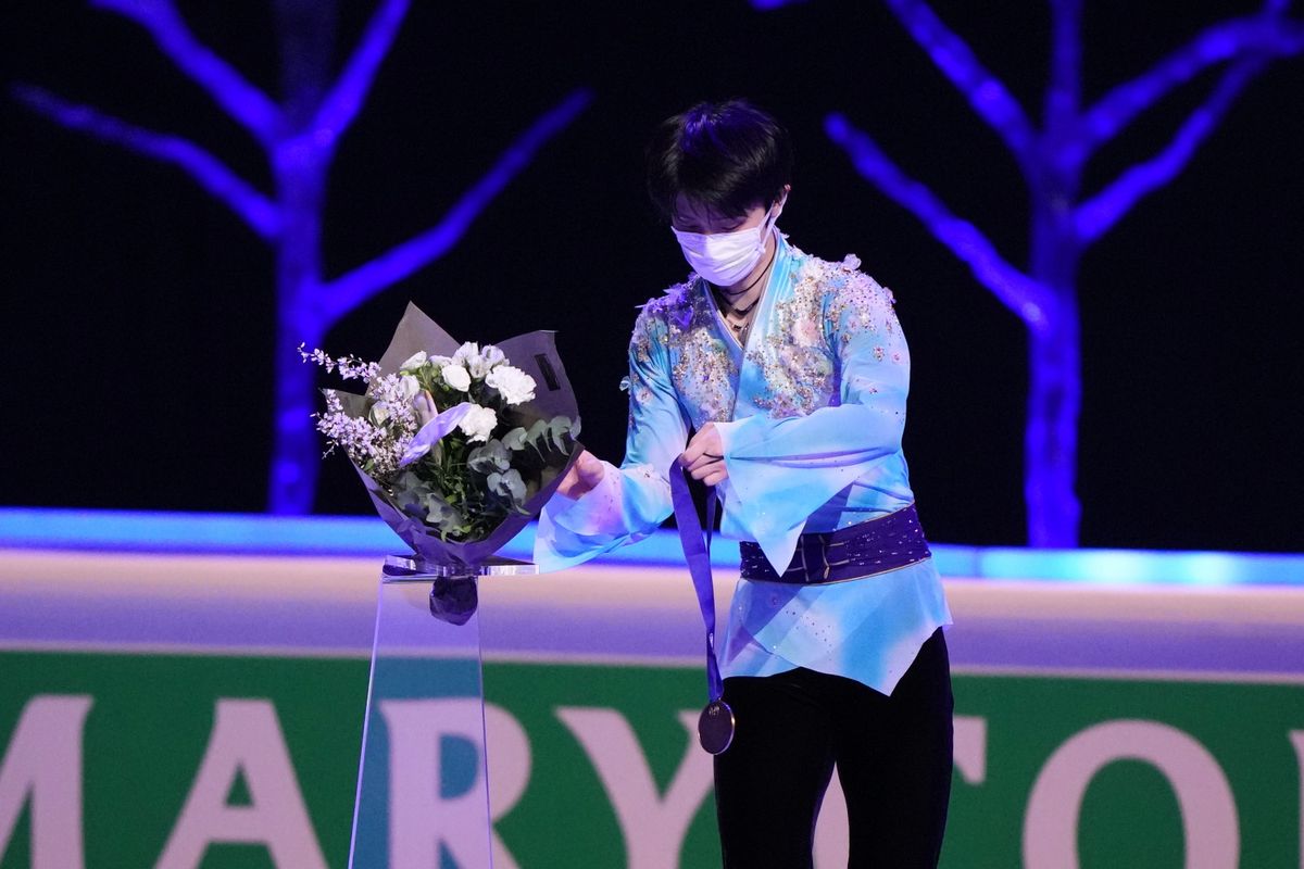 表彰での羽生選手。台の上に置かれたメダルと花束を、自分で取ります。最近はいろんな競技でこの形を見ますが、少し寂しいですね。
