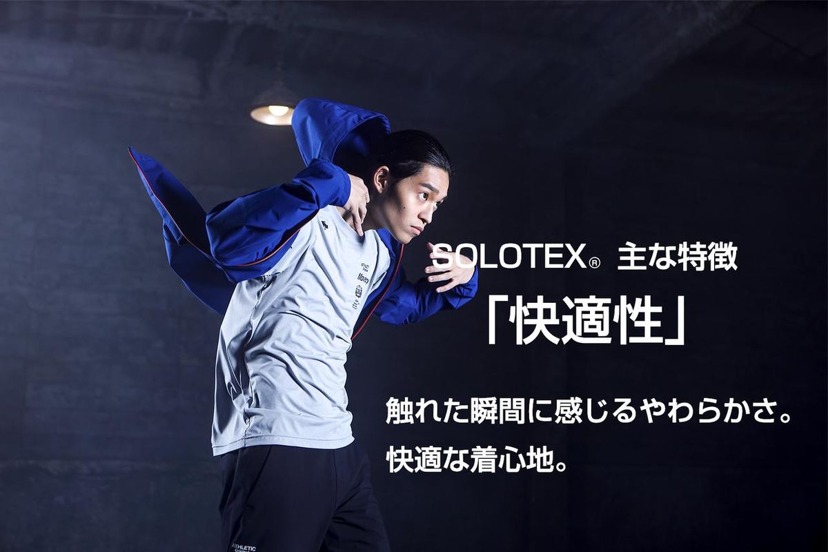やわらかで軽く、快適な着心地を実現し、身に纏う者に驚きさえ感じさせる、この新ウェアの誕生には、素材として採用したマテリアルメーカー、帝人フロンティアのSOLOTEXⓇ(ソロテックス)の存在が大きい。従来の繊維、ポリエステル、ポリウレタン、ナイロンのそれぞれの長所、形態の保持、ストレッチ、風合い、すべてをもつ夢の新素材ともいわれている。