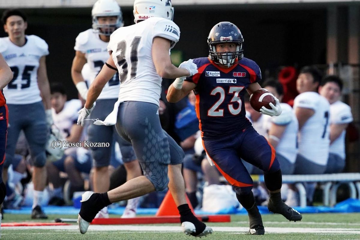 【ノジマ相模原 vs 明治安田】ランアフターキャッチでロングゲインするノジマ相模原WR伊藤.須永HCも期待をかける=富士通スタジアム川崎で2019年4月21日 撮影 小座野容斉