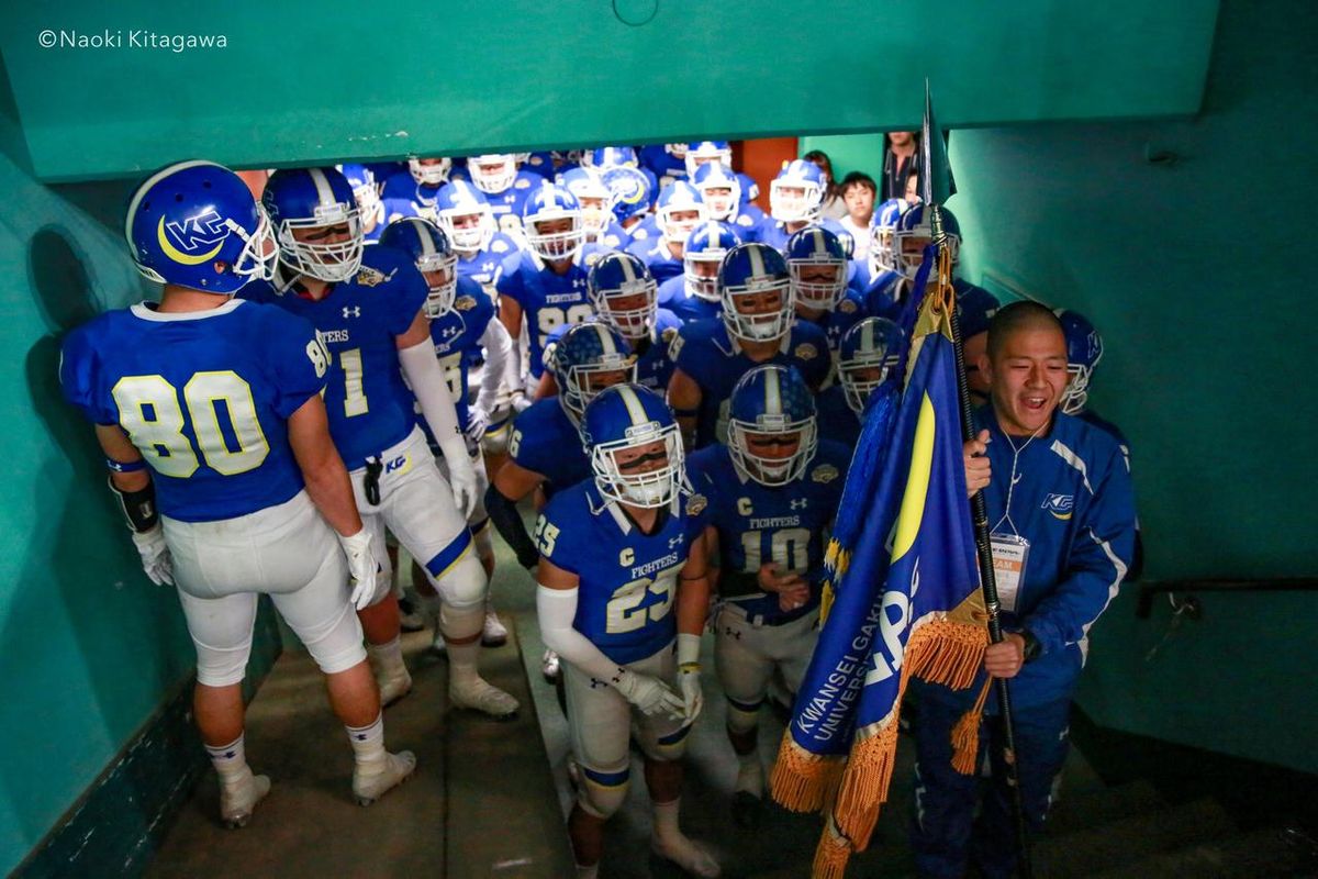 関学は、甲子園ボウル以降のボウルゲームで、毎試合違う部員が選手入場の騎手を務める。選手だけではなく、主務も含めた幹部の誰かが持つことになっているという。甲子園ボウルでは副将の横澤良太が、ライスボウルでは、主務の安西雄平が旗手を務めた。