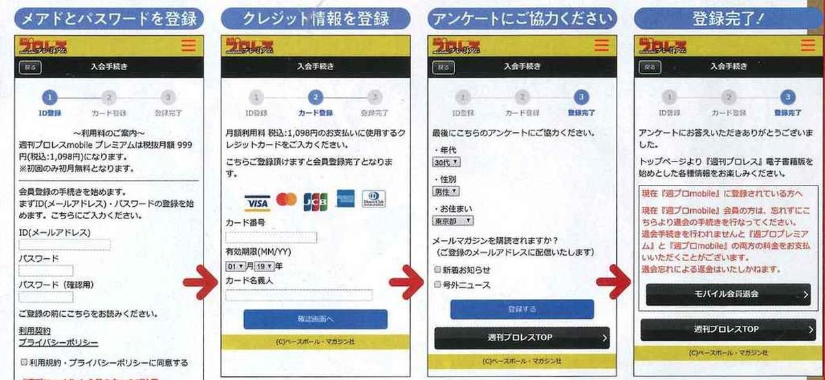 登録方法は簡単3ステップ! 『週刊プロレスmobile』内に表示される『週刊プロレスmobileプレミアム』案内ページの「プレミアム版に登録」をタップし、①メアドとパスワードを登録、②クレジットカード情報を登録、③アンケートにご協力いただき…登録完了!