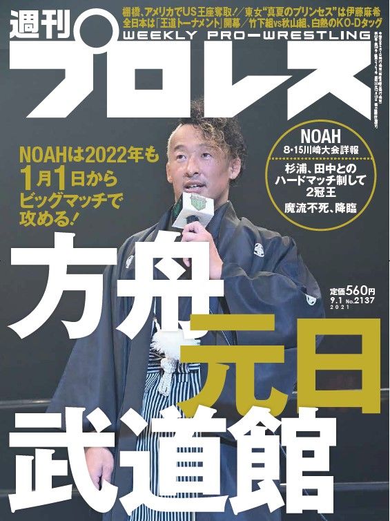 今週号の掲載内容は…2022年元日の武道館大会を発表!杉浦貴、田中将斗とのハードマッチ制して2冠王。魔流不死、降臨。NOAH8・15川崎大会詳報/短橋弘至、アメリカでUS王座奪取!/東京女子“真夏のプリンセス”は伊藤麻希/全日本「王道トーナメント」開幕/竹下幸之介&勝俣瞬馬と秋山準&岡田佑介、白熱のKO-Dタッグ、ほか。