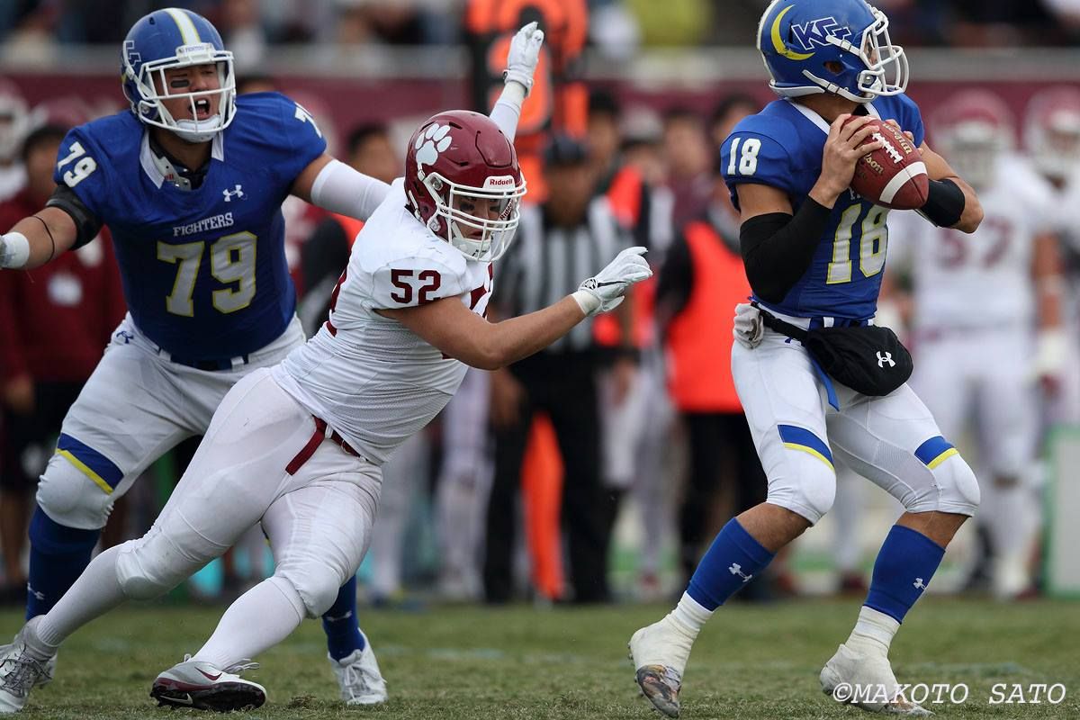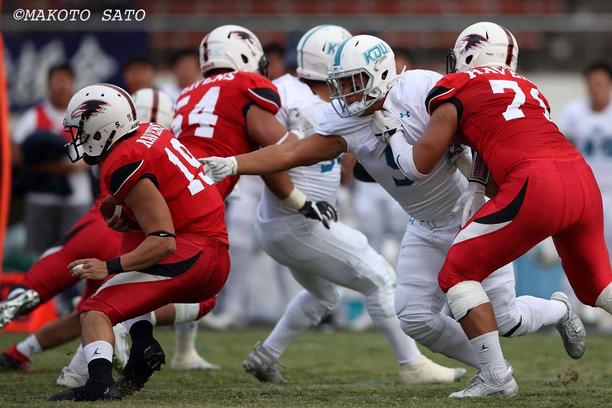 QB SACKS 4回20ヤードの立命DL52辻井 撮影:佐藤 誠
