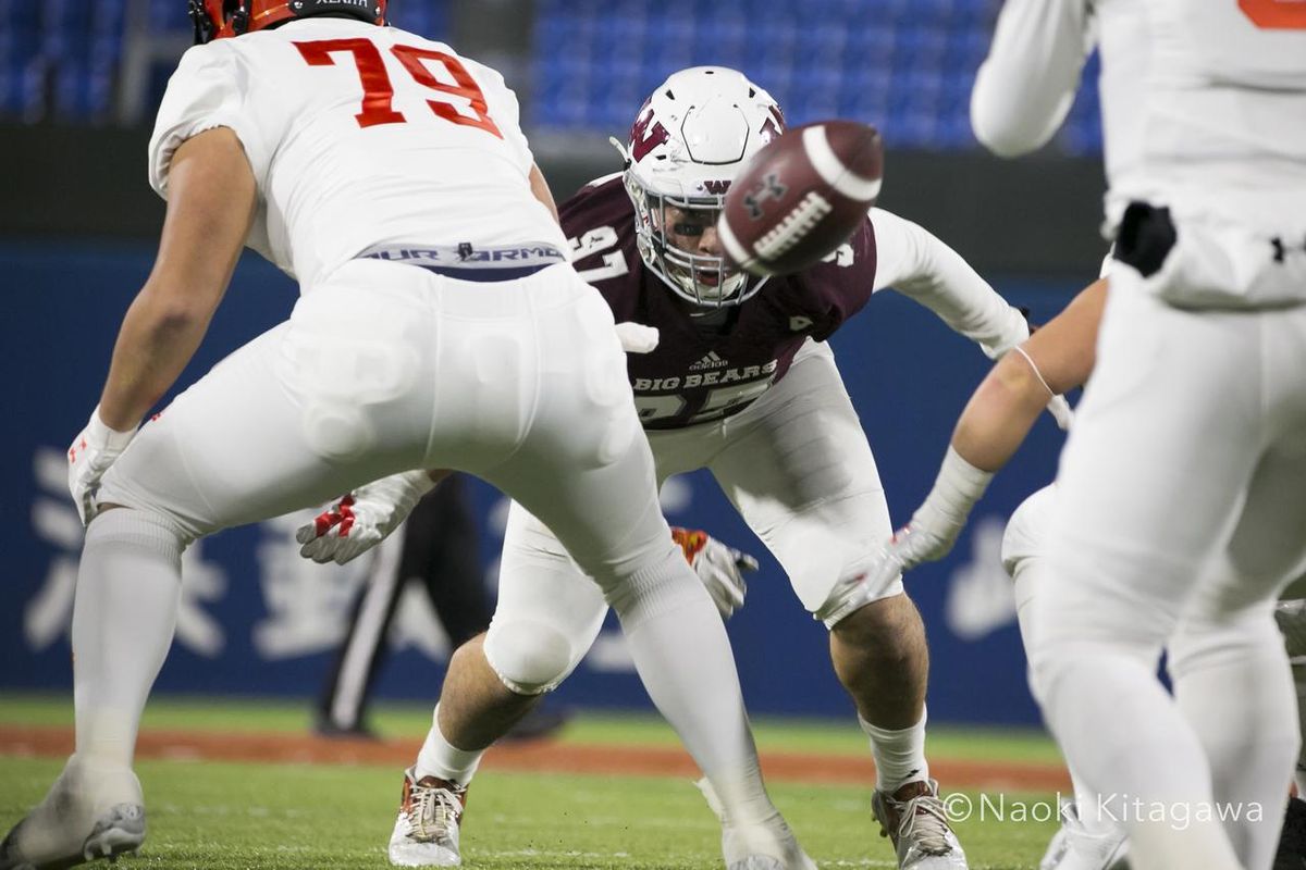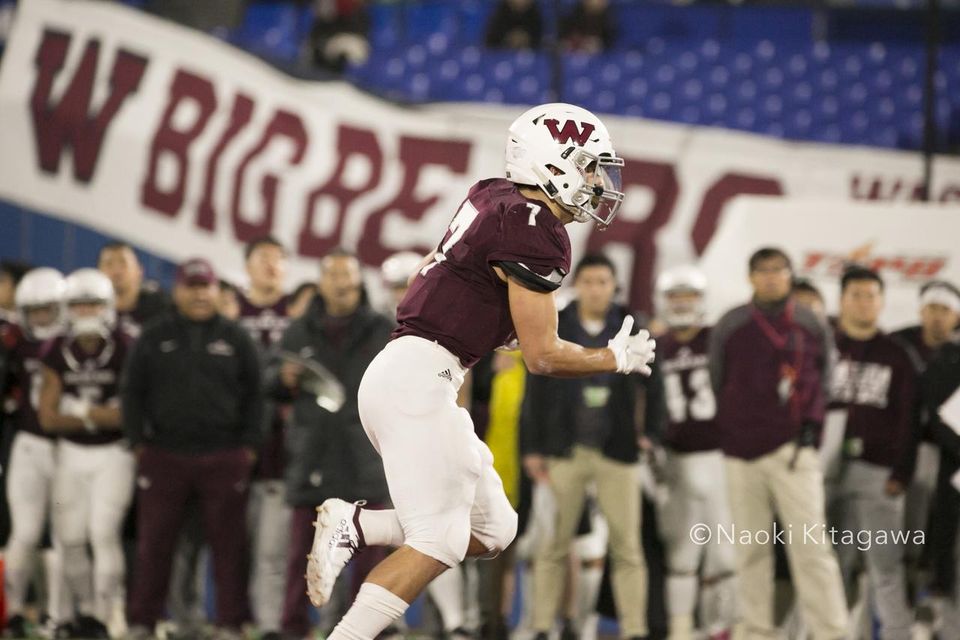 この日も、高津佐に加え、スクランブルが得意な#12勝本、RB出身ながら非凡なパスセンスを見せる#8小田賀と3人のQBを目まぐるしくローテーションして早稲田の守備をかき乱した。高津佐は本業のWRでパスレシーブ90ヤード、キック、パントのリターンで93ヤード。パスでも137ヤードを奪う八面六臂の活躍。ただ、第1Qと第3Qの2本を含む3インターセプトが悔やまれた。