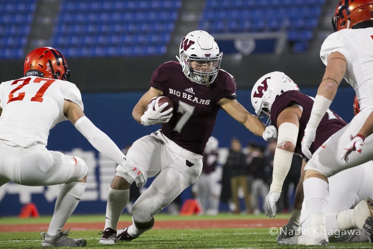 タフなランでシーズンを通して早稲田攻撃をけん引した、RB#7元山伊織(撮影:北川直樹)