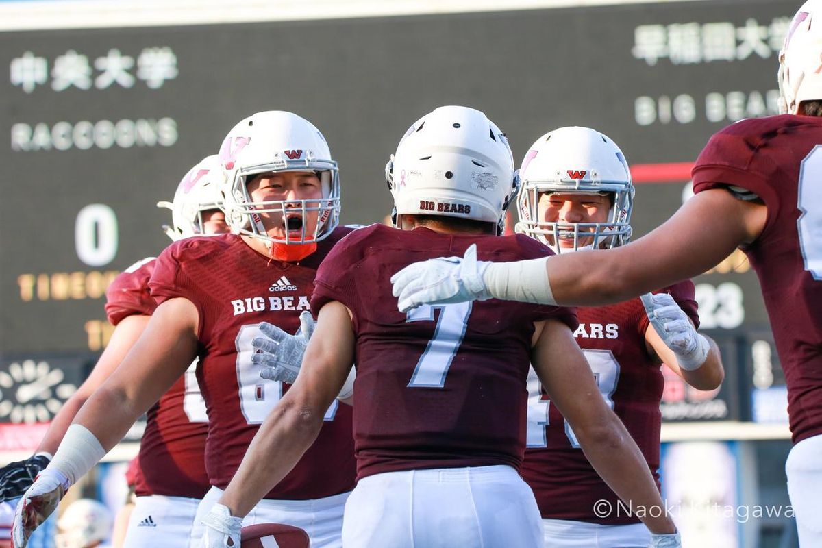 国内のアメリカンフットボールは今週末の3連休、大一番が目白押しだ。関東学生1部TOP8は、優勝をかけ、早稲田大と法政大が激突する。第1試合の明治大対慶應大戦で、明治大が勝って1敗を守った場合、早稲田大は勝つか、引き分けるか、5点差までの敗戦で優勝。法政大は6点差以上の勝利で優勝となる。明治大が2敗となった場合は、勝った方が優勝となる。