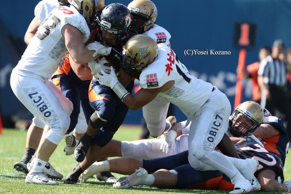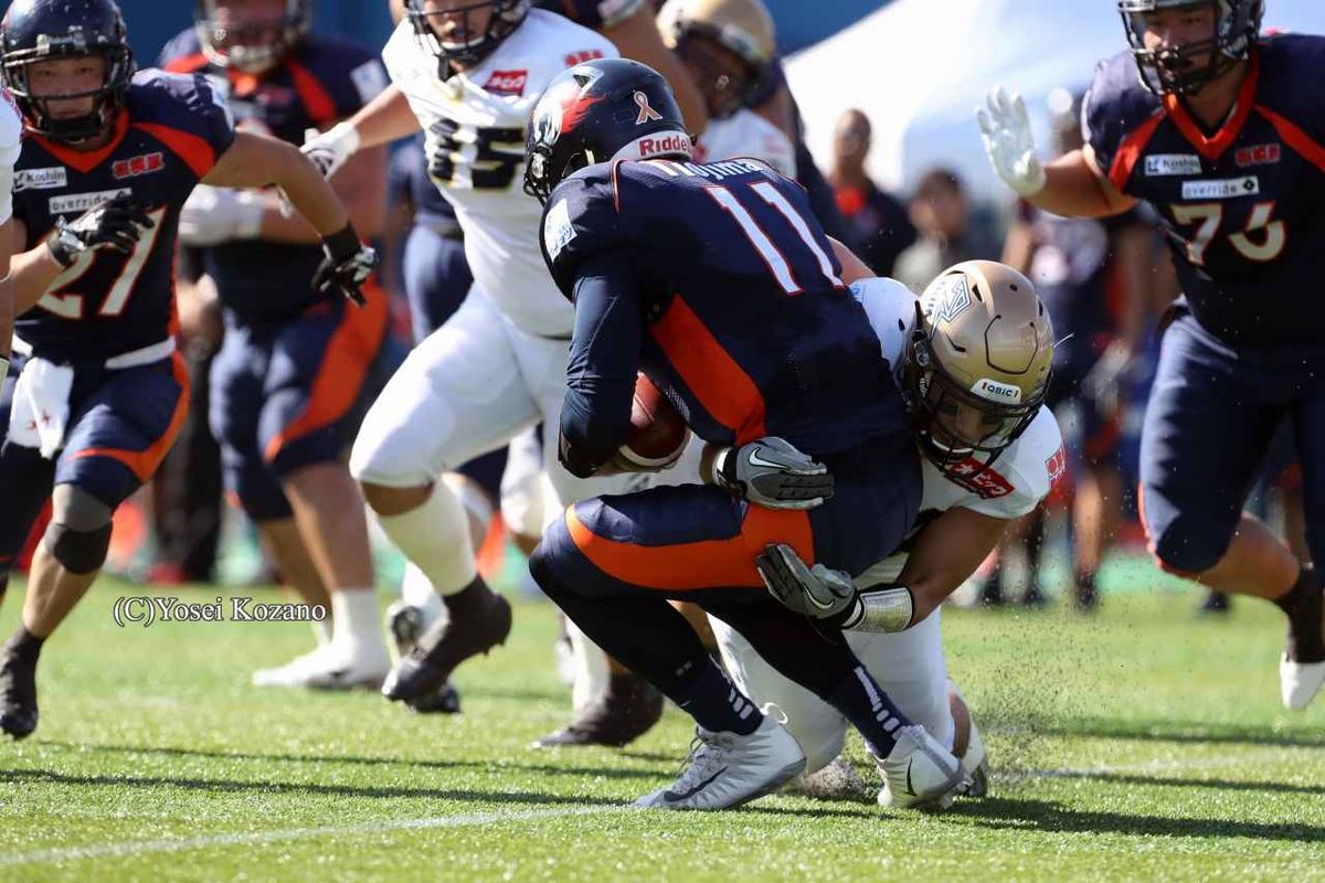 11月10日のJXBトーナメント準々決勝、ノジマ相模原ライズ戦。序盤に良い形で先制、追加点となるタッチダウンを決め、主導権を握ったオービックだが、ディフェンス的にはらしくない形が続いていた。ノジマ相模原のパスオフェンスを断ち切れないのだ。