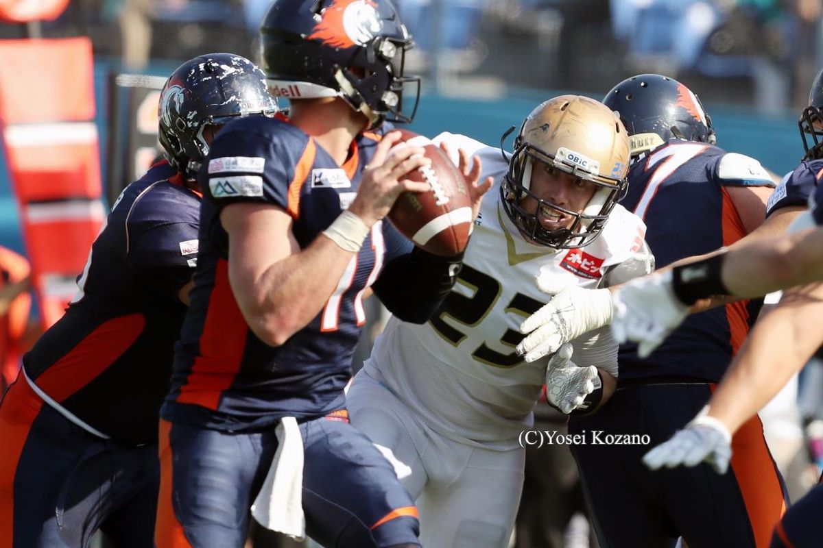 特別なディフェンスを仕掛けたわけでもなく、いつものような4DLの隊形だ。ただサードダウンでは、ビーティー・ジュニアやケビン・ジャクソン、ルーキー佐藤将貴らDEに加え、インサイドにも三井勇洋、江頭玲王、中田善博らがセットした。