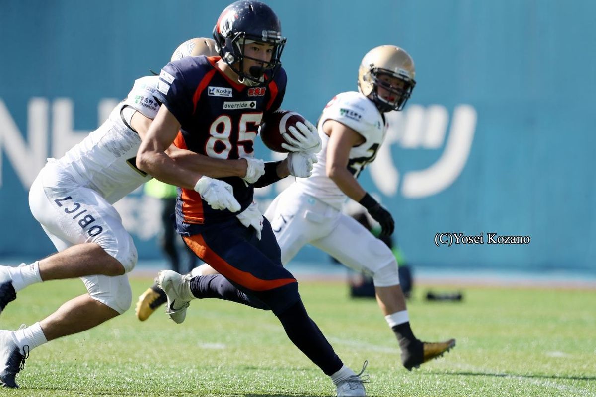 オービックは第1クオーター(Q)3分に、QBスカイラー・ハワードからWR西村有斗に32ヤードのタッチダウン(TD)パスが通って先制。9分には、スカイラーから西村に17ヤードTDパスが決まって14-0とした。先制TDはWR池井勇輝の53ヤードパントリターン、2本目のTDはノジマ相模原のミスでフリーボールになったパントを押さえたのが起点と、敵陣深くからの攻撃開始をきっちりTDに結び付けた。