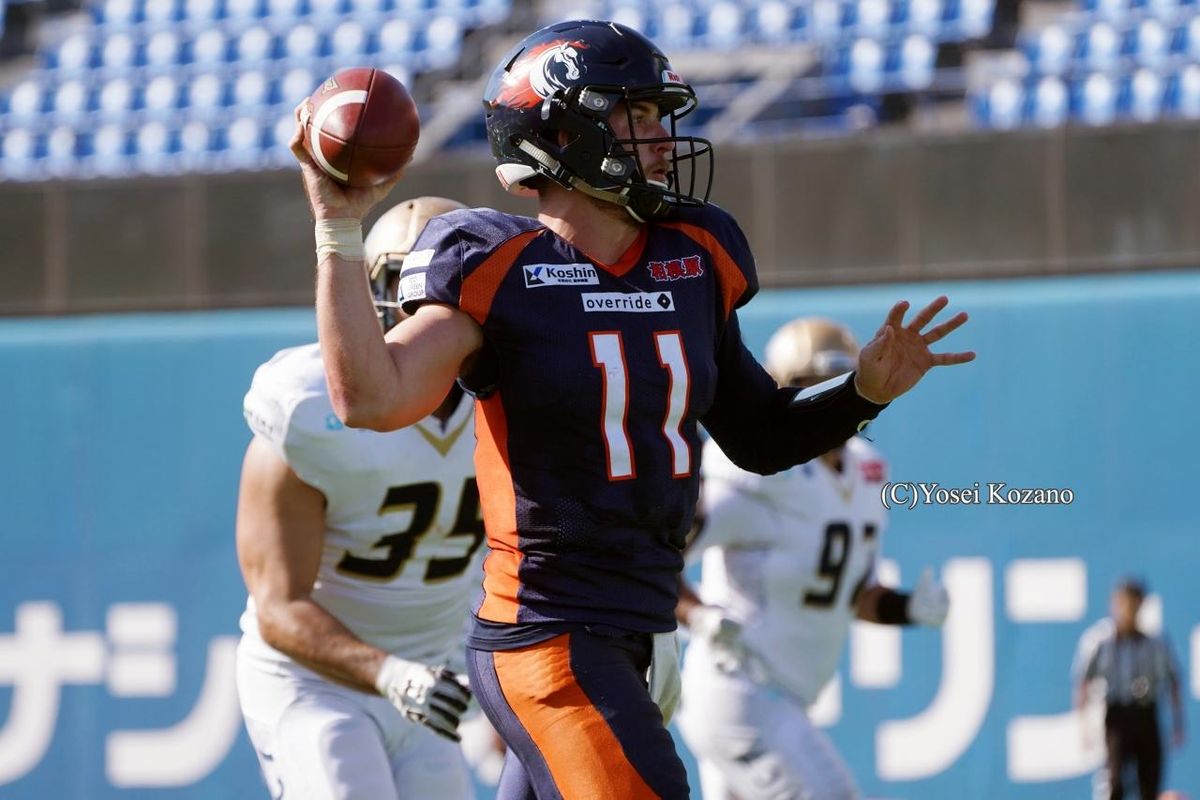 【オービック vs ノジマ相模原】第2Q残り17秒、右にロールしながら絶妙のコントロールでTDパスを決めたノジマ相模原QBロックレイ=2018年11月10日 撮影 Yosei Kozano