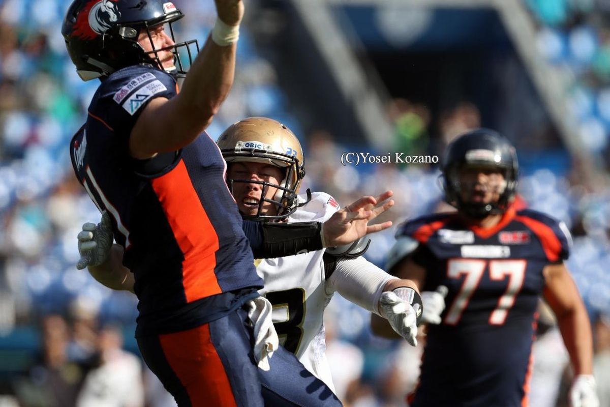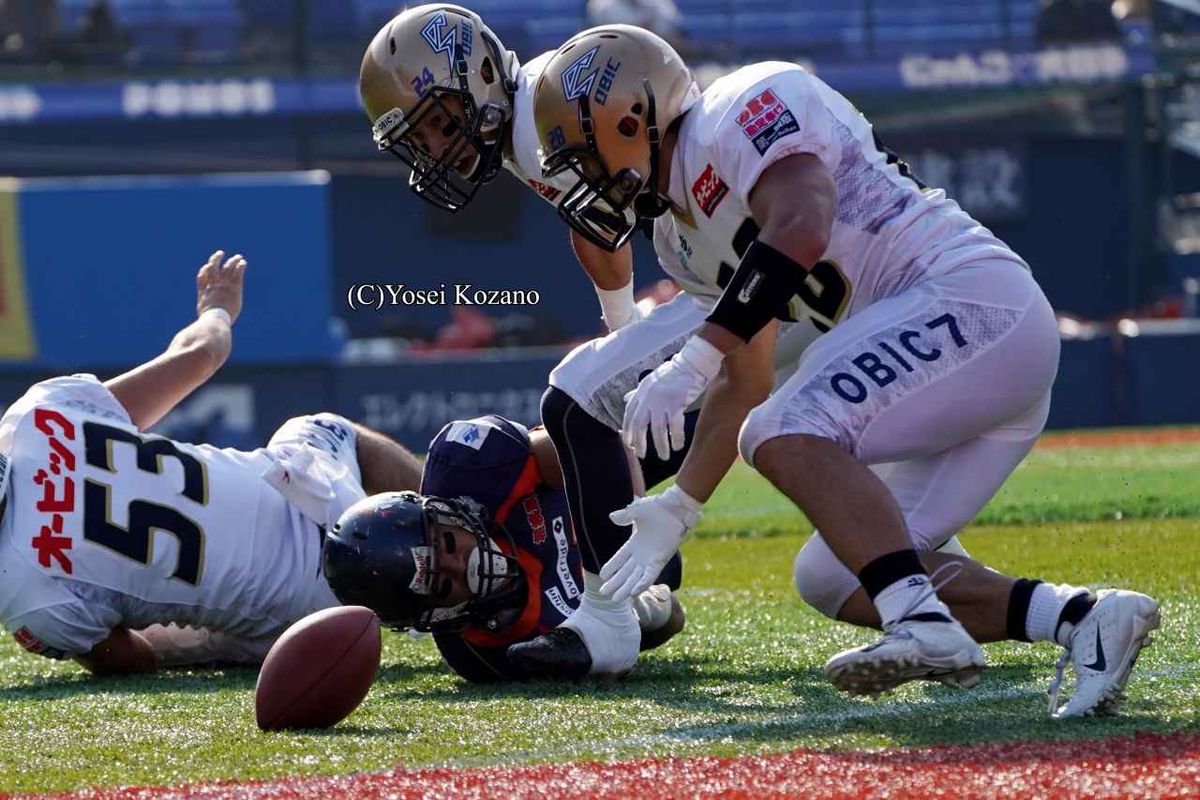 前半だけでパス267ヤードのロックレイに対して、後半からオービックディフェンスはパスラッシュを強化、ノジマ相模原オフェンスを4シリーズ連続で3&アウトのパントに追い込んだ。オービックオフェンスは、2インターセプトを喫するなど決して順調ではなかったが、敵陣に攻め込んだシリーズを必ずTDに結び付ける勝負強さを見せ、リードを再び広げた。第4Q終盤にはパントボールをファンブルリカバーして攻撃権を奪い、RB望月麻樹のTDで勝利を決定的にした。オービックはこの試合、ニーダウンした1回を除く14回のオフェンスシリーズで、敵陣まで攻め込んだのは6回。その6回をすべてTDに結び付けた。