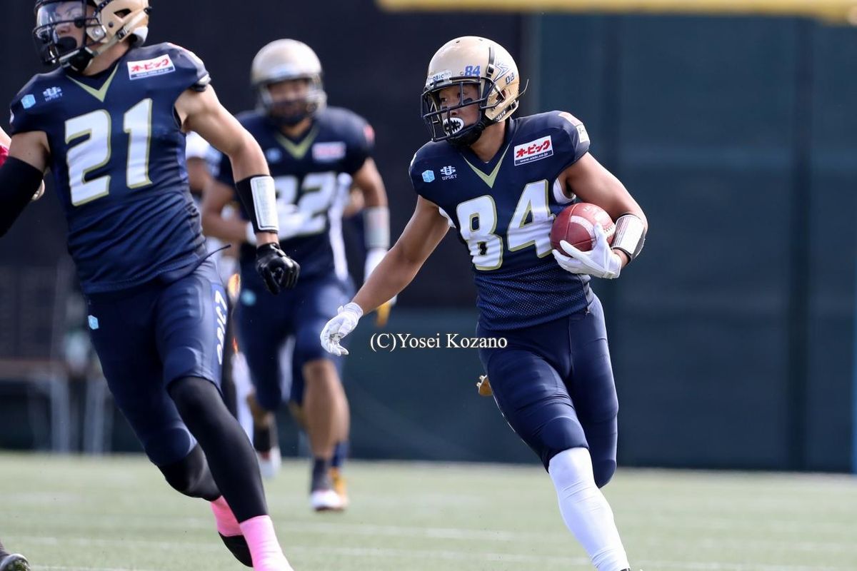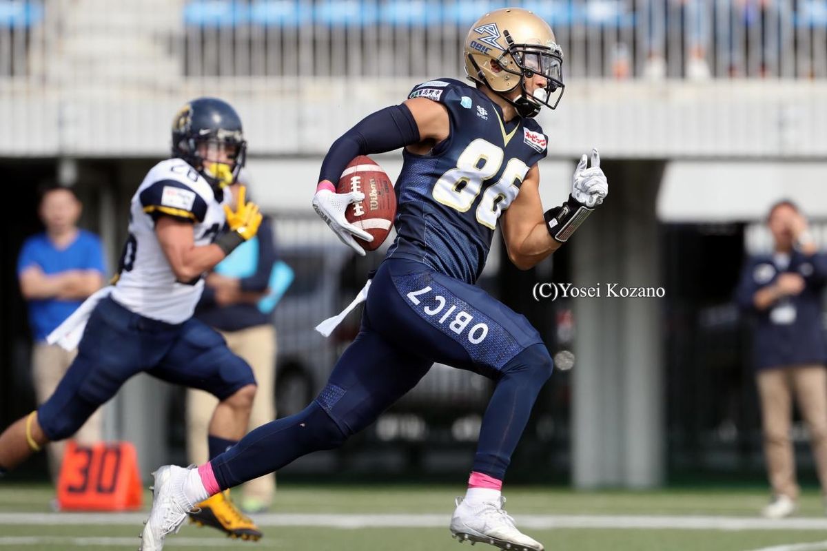 オール三菱戦では123ヤード、3TDパスをキャッチした。QB菅原俊からの53ヤード、48ヤードの2本のTDはマンツーマンカバーのDBを、スピードで完全に抜き去っていた。