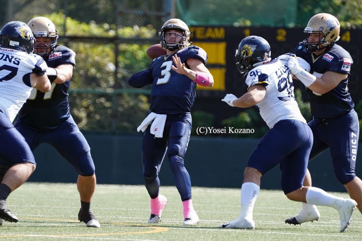 オービックといえば、ディフェンスが看板だ。第5節富士通戦で今季最多の31失点を喫したが、反則による罰退90ヤードと、前半最後のマネジメントに問題があった。