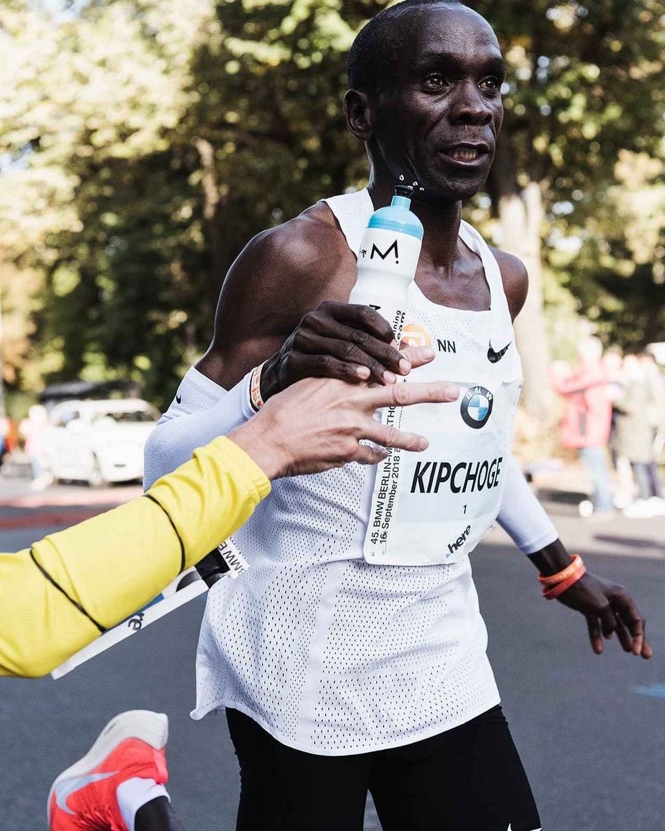 2018年のベルリンマラソンで世界記録を出したときに、モルテンの給水を受けるキプチョゲ選手