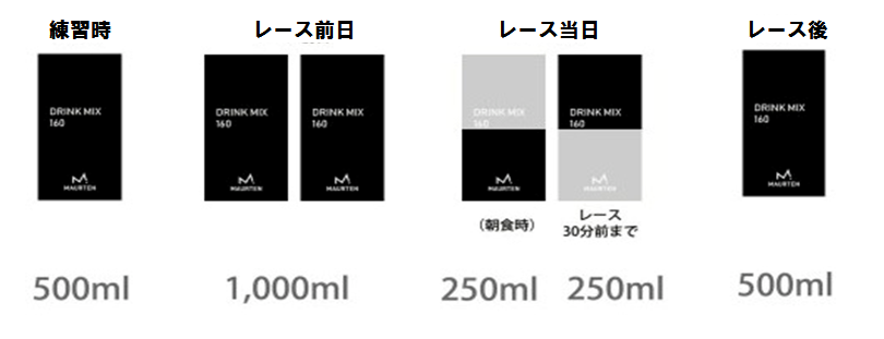3、大会当日、朝食と一緒に半分の250mlを飲み、レース本番30分前に残りの半分の250mlを飲む。