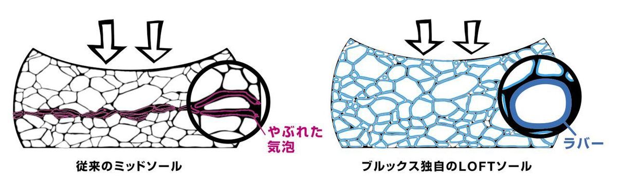 DNAロフトはハイクッションソールというだけあって柔らかい。これまでのブルックスDNAに比べて30%も柔らなくなっている。また、従来のミッドソール素材であるEVA(ビニール・エチレン・アセテート)は気泡がつぶれやすかったのに対して、EVAとラバーをブレンドしたDNAロフトは、気泡がつぶれにくい。つぶれにくい気泡は空気を多く含んでいるので軽くすることができるうえに、へたりにくくなった。