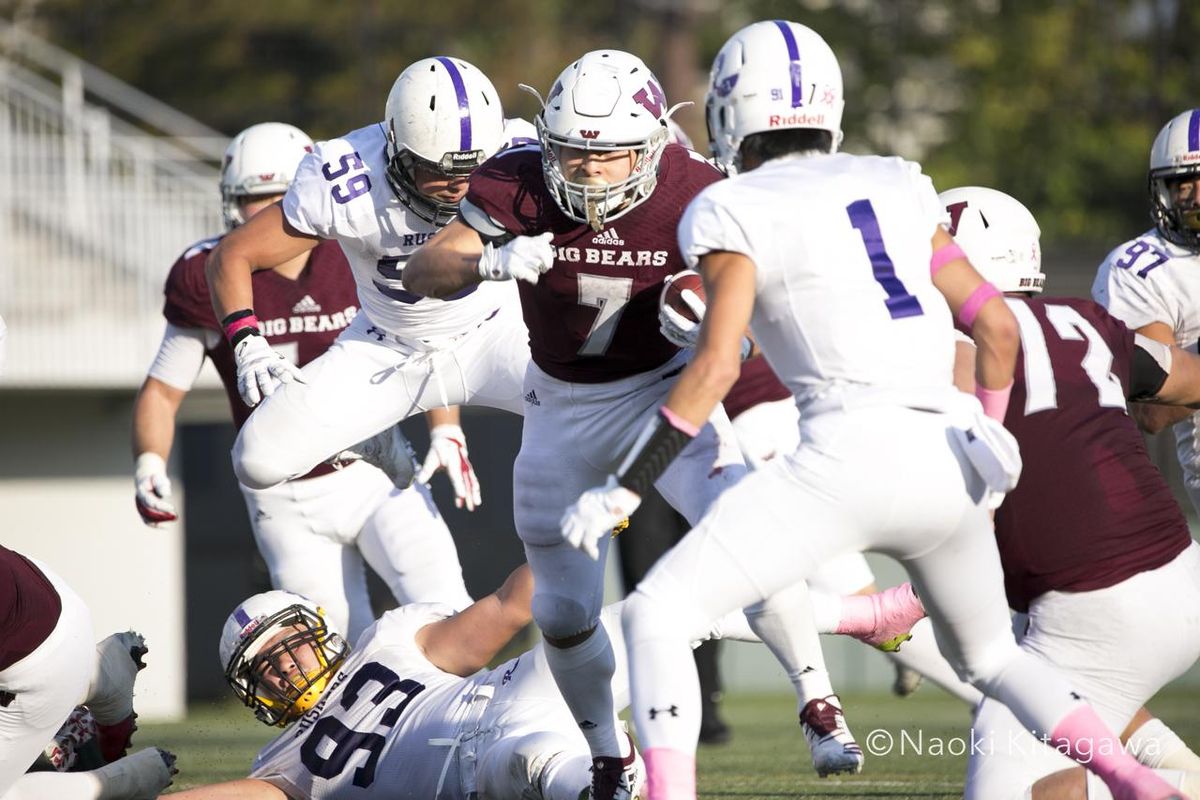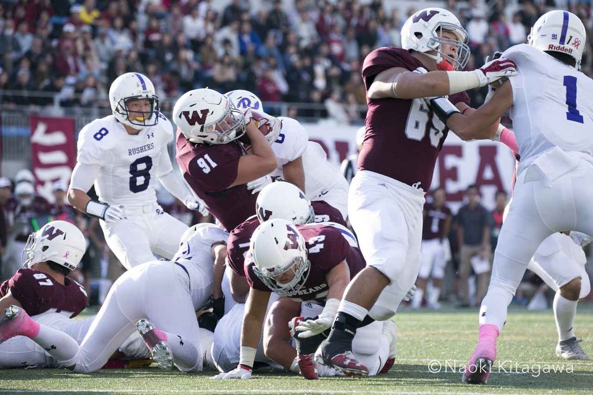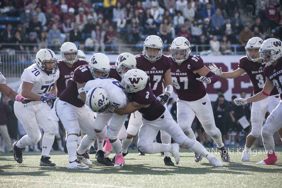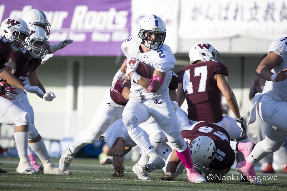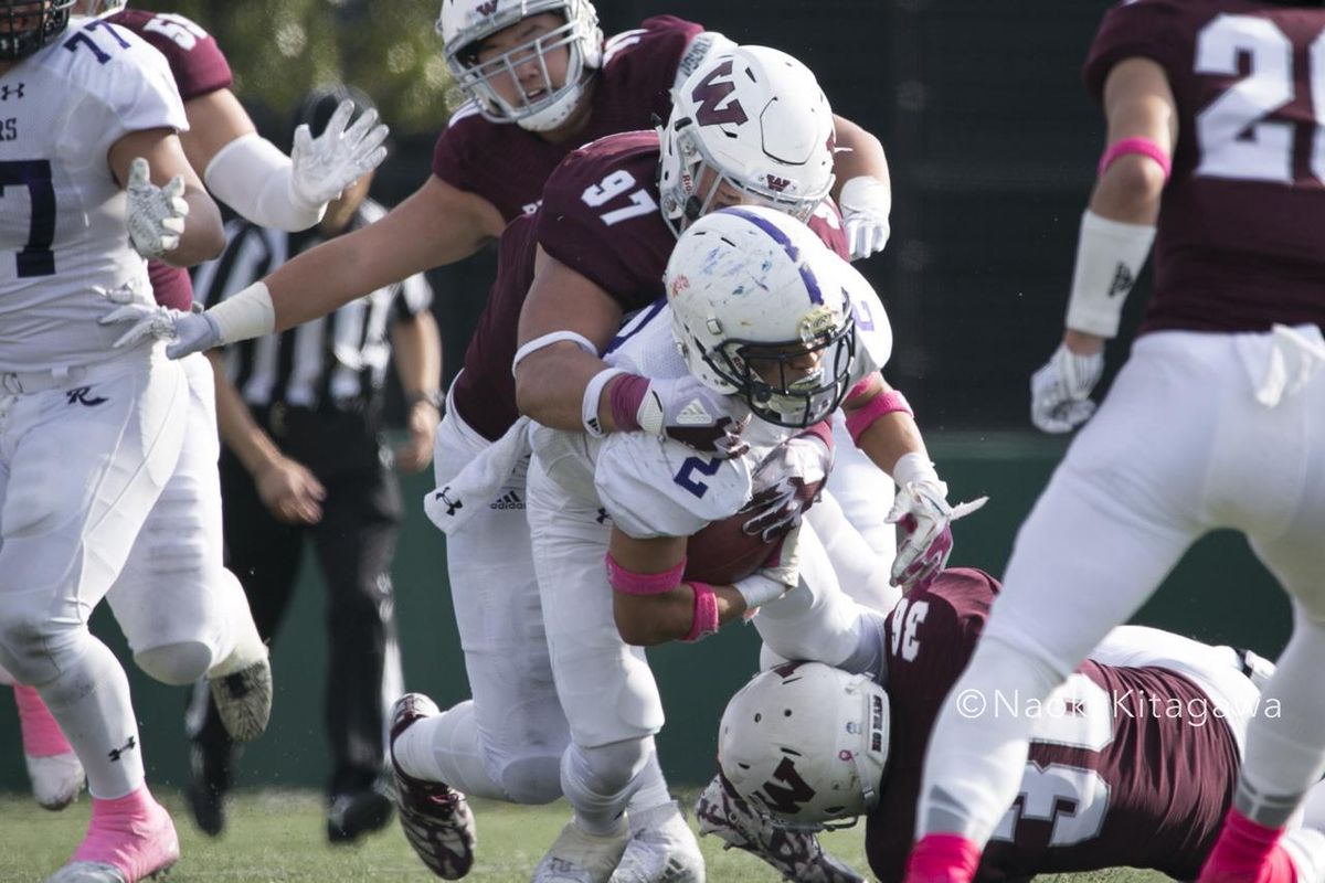 早稲田大は、第3QにエースRB#7元山の2TD、K#96高坂の45ヤードFGで加点、第4QにRB高瀬の2本目のTDで勝利を決定的にした。