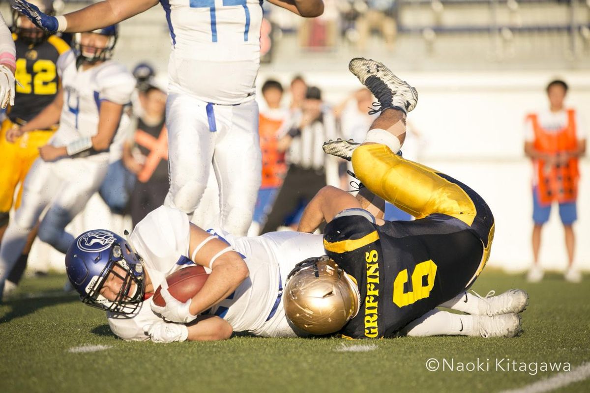 明治大は第3Q冒頭にLB#1徳茂がインターセプトを決め、第4Q終盤にはゴール前1ヤードを守りきるなど、後半も守備が集中力を発揮した。攻撃は、第4Qに西本がTE#85三輪へTDパスを通し、差を2ポゼッションに広げ、ロースコアゲームを勝ち切った。