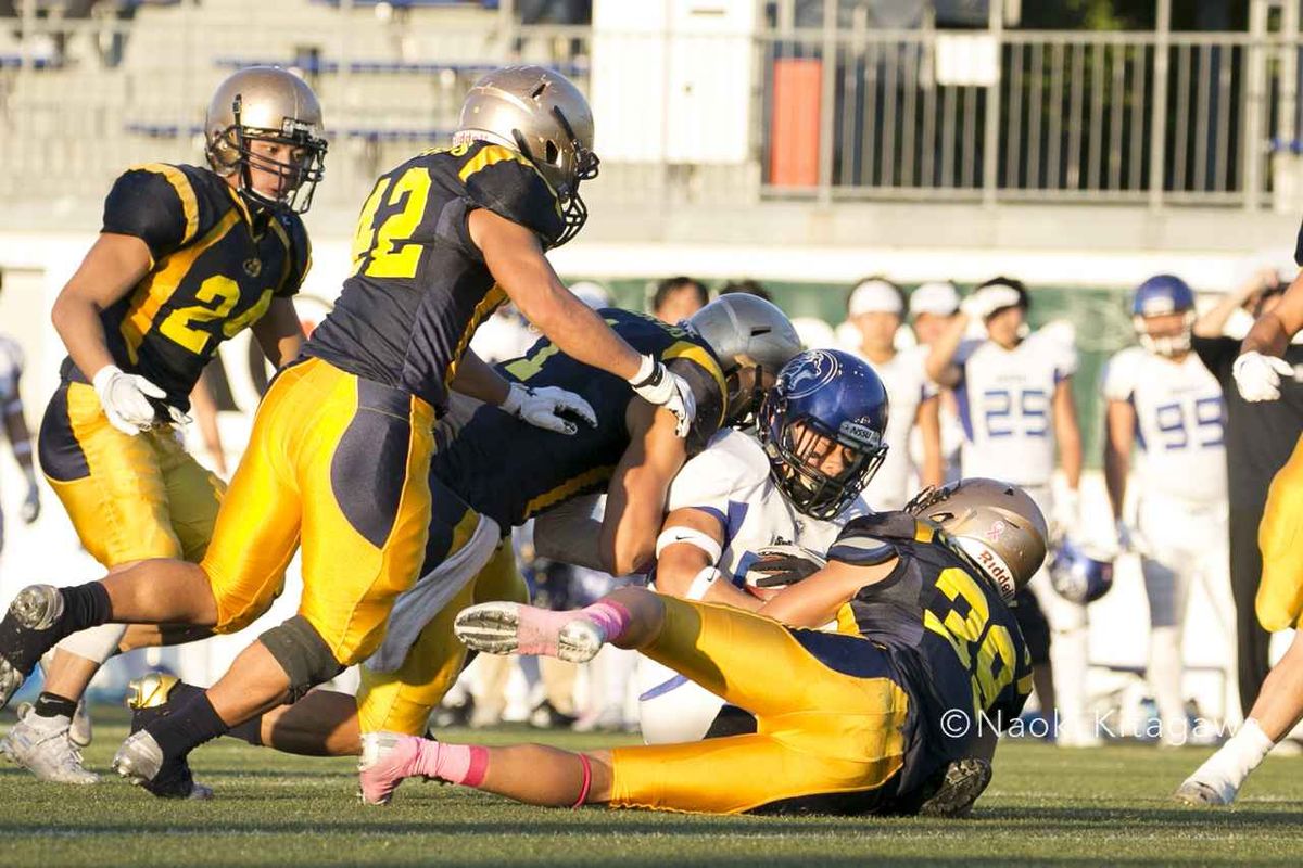 明治大主将LBの茂木がロスタックルを決めた。局面での守備の集中力が光った(撮影:北川直樹)