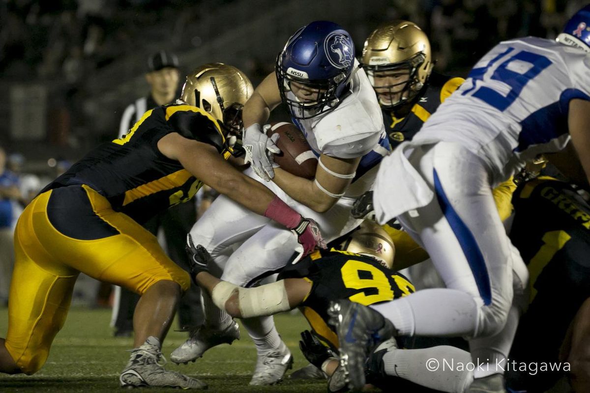 アメリカンフットボールの関東学生1部TOP8第5節、明治大学対日本体育大学の一戦が10月27日(土)に、アミノバイタルフィールド(東京・調布)であり、明治大学が16-0で、第3節から3試合連続での完封勝ちを納めた。これで今季の通算成績は、明治大は4勝1敗、日体大は5敗となった。