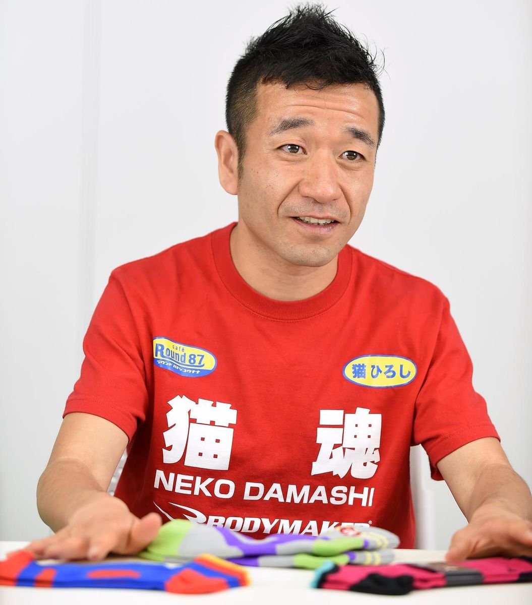 猫 何年か前に僕のホームページにメッセージがきたのです。熱量がすごく多いメールです。「ソックスを作りたい。ランニングといえば猫ひろしさんです。よろしくお願いします」と。だいたい、ホームページにくるメッセージは、変な人からくることが少なくないんです。怪しかったので、しばらくそのままにしておいたんです。そしたら、1週間に10回くらい「猫さん、よろしくお願いいたします」と(笑)。これは本気だなと思って、事務所にこういうメッセージが来ていますと連絡しました。すでにそのときには事務所にもその人から連絡が来ていて、「土橋商店さんでしょうと。面白いから電話してみようとマネジャーが電話をしたら、すごく面白い人でした。