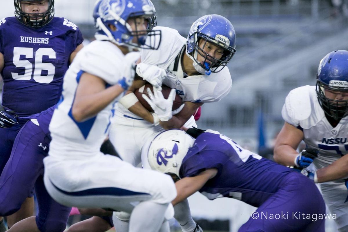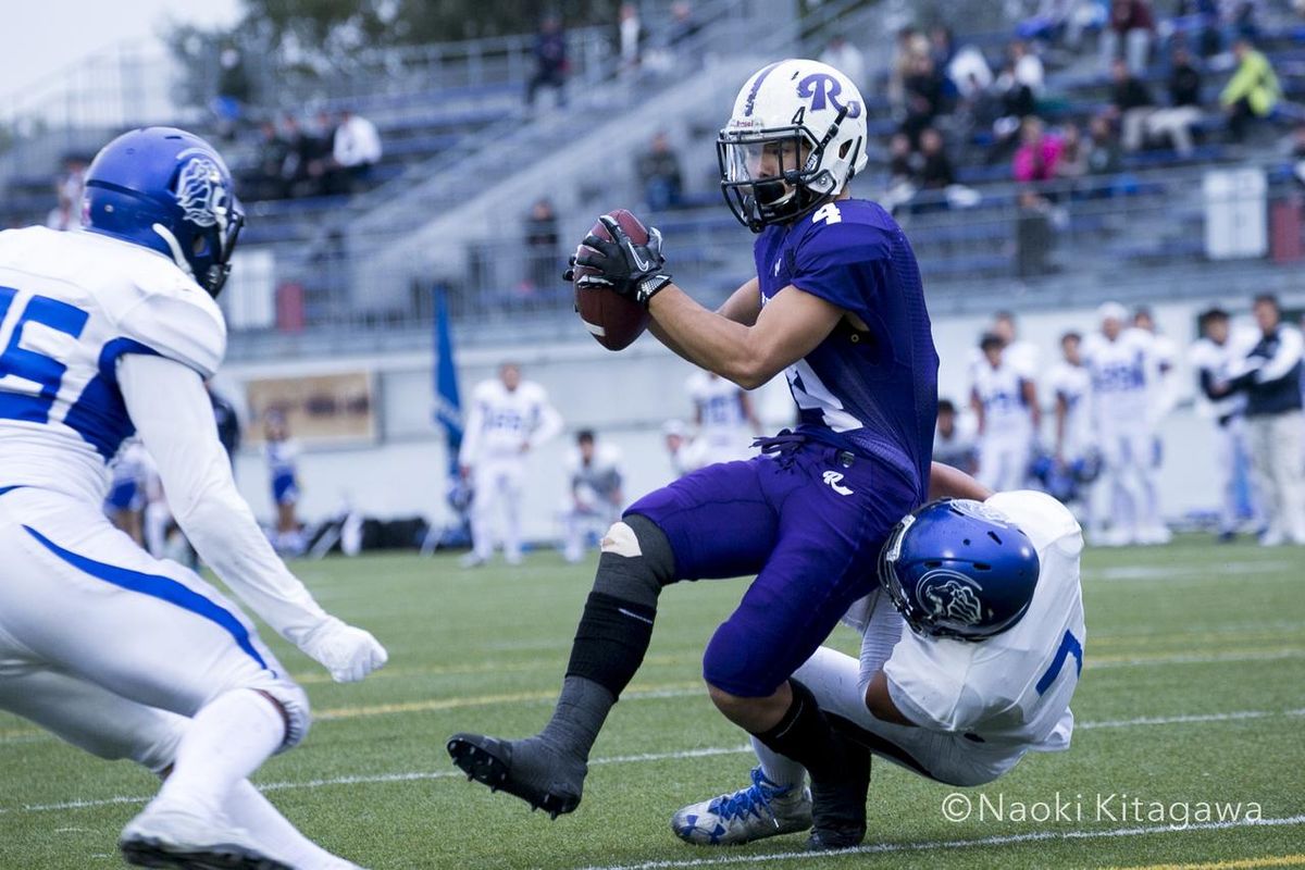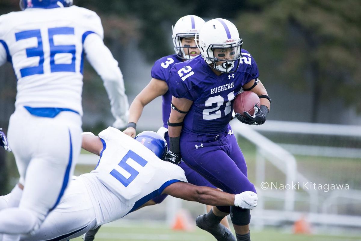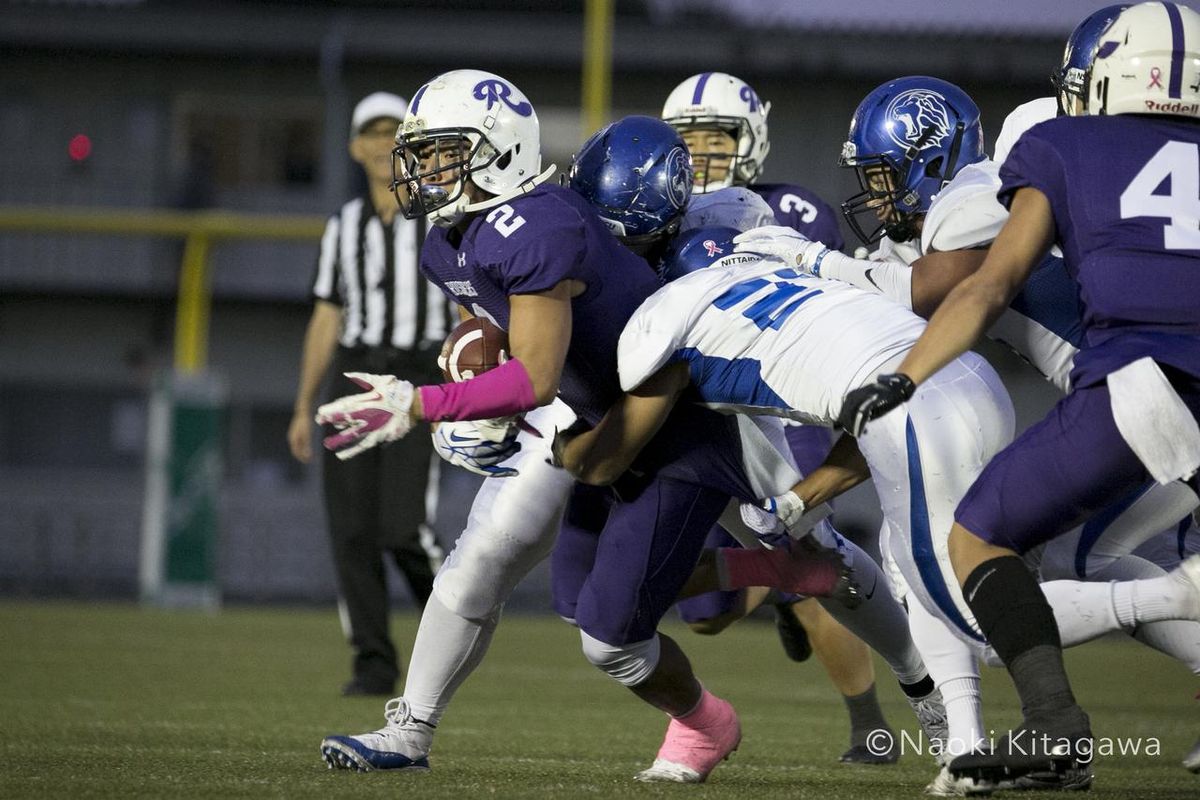 日体大守備は立教大ラン攻撃を厳しくチェックしたが、立教大攻撃が徐々に上回った。RB#2荒竹悠大(撮影:北川直樹)