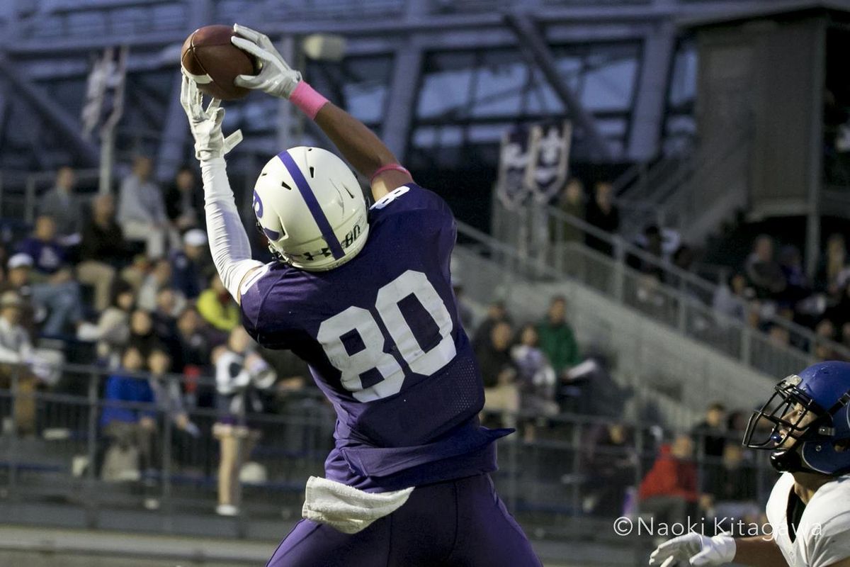 立教大のエースWR#80河本航太郎が日体大CBをかわしてTDパスを好捕球(撮影:北川直樹)
