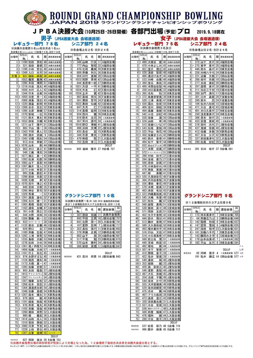 ROUND1 GRAND CHAMPIONSHIP BOWLING 2019 JPBA決勝大会の各部門出場プロ(予定/2019.9.18現在)が下記の通り発表されました。
