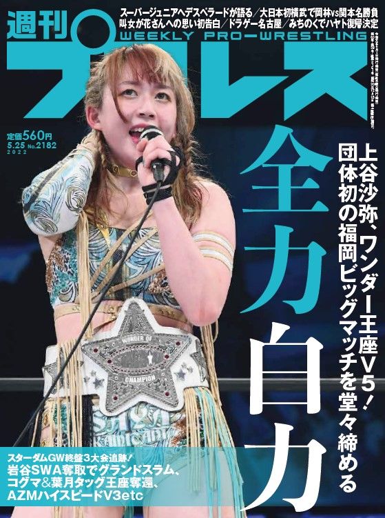 今週号の掲載内容は…上谷沙弥、ワンダー王座V5!団体初の福岡ビッグマッチを堂々締める。スターダムGW終盤3大会追跡!岩谷麻優SWA奪取でグランドスラム、コグマ&葉月タッグ王座奪還、AZMハイスピードV3 etc/スーパージュニアへエル・デスペラードが語る/大日本初横浜武道館で岡林裕二vs関本大介名勝負/ジャングル叫女が木村花さんへの思い初告白/DRAGONGATE名古屋/みちのくでフジタ“Jr”ハヤト復帰決定、ほか。
