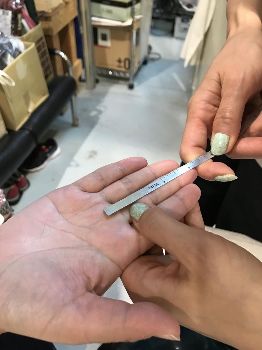 メジャーボール上だけでなく、確認のために実際の手の長さも測ります。ほとんどの人が薬指より中指の方が長いと思います。手のひらを上にして、指関節の中指と薬指の線の差が8分の3インチから16分の5インチで、ボール上では親指からの距離が±0になります。女性の場合、私は16分の5インチを基準にしています。