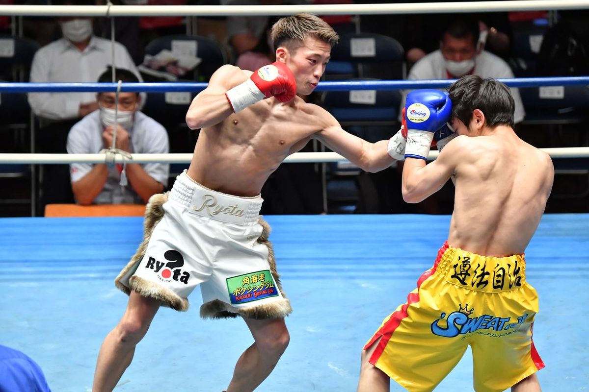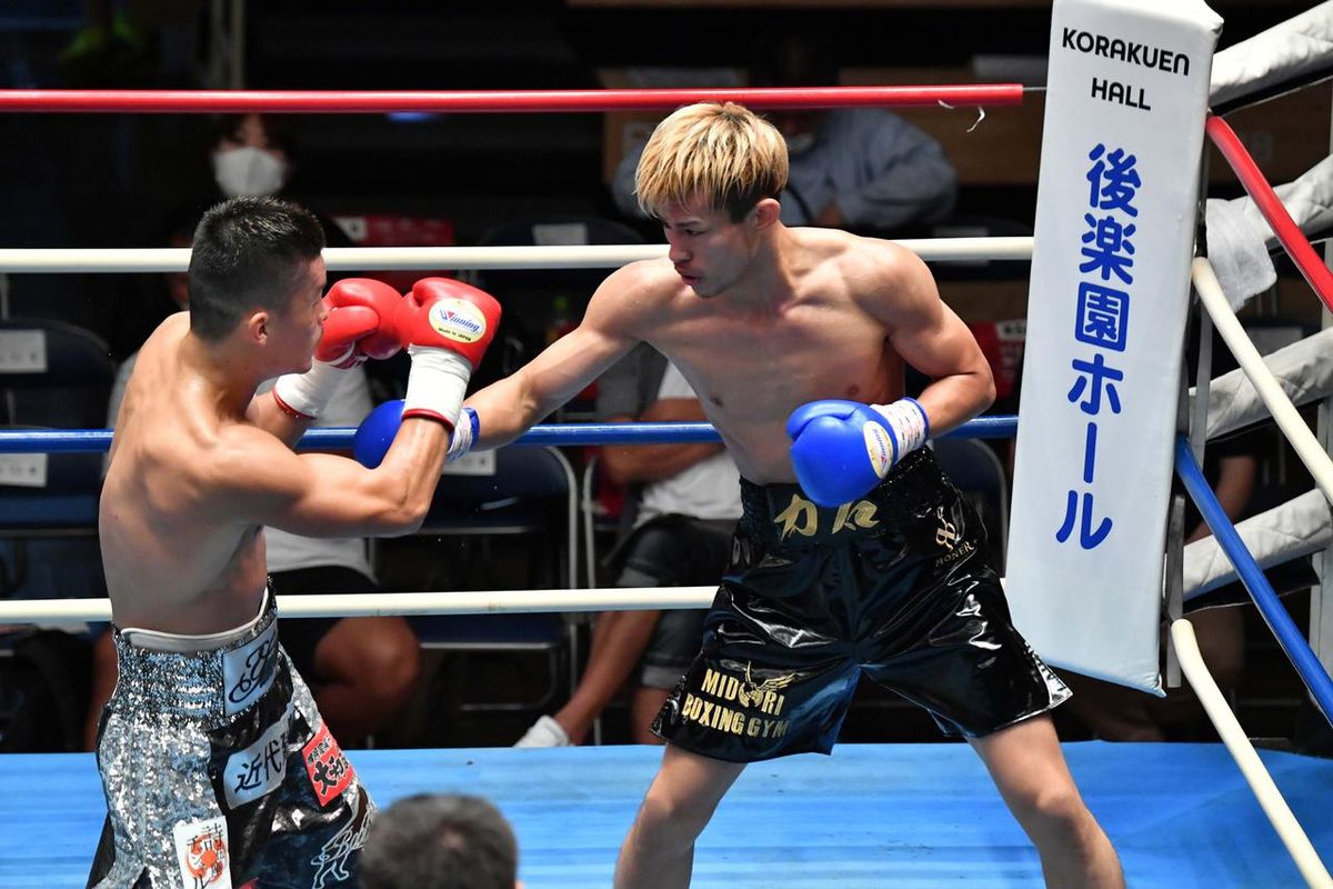 力石(右)は徹底したアウトボクシングで粕谷を寄せつけなかった