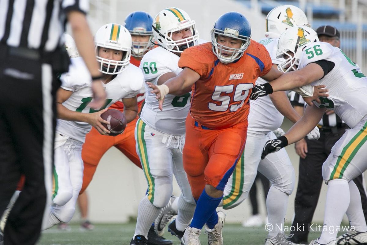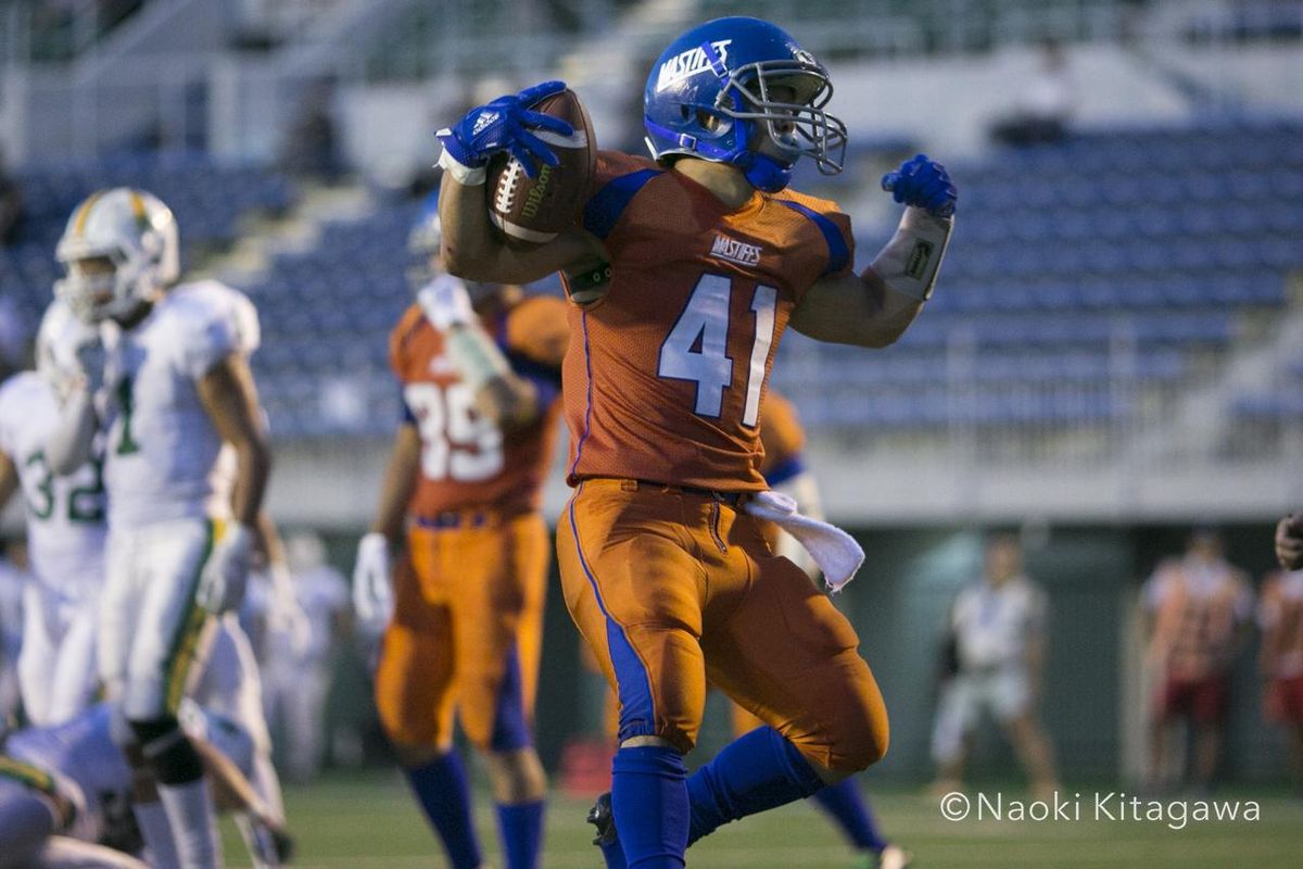 専修大は、第2クオーター(Q)にQB#14坪沼のスクランブルからのTDと、第3QのDB#1内村のキックオフリターンTDの2本を返したにとどまった。横国大は2連勝、専修大は2敗となった。